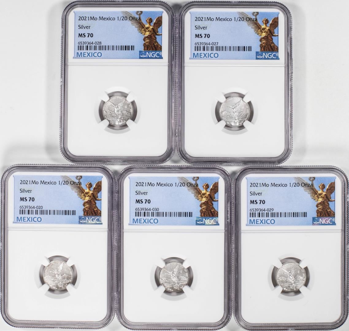 Lot of (5) 2021-Mo Mexico 1/20 oz Silver Libertad Coins NGC MS70