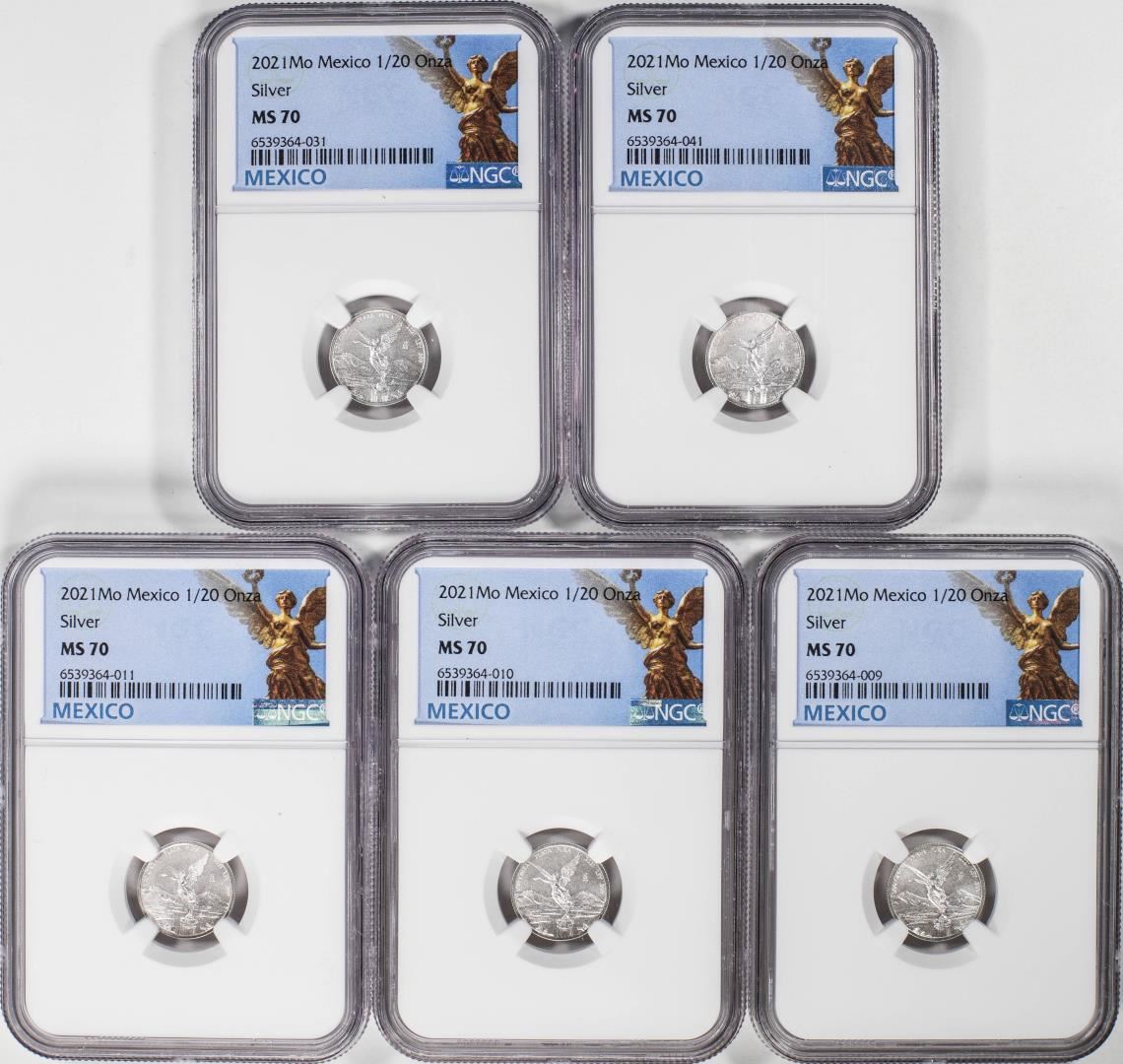 Lot of (5) 2021-Mo Mexico 1/20 oz Silver Libertad Coins NGC MS70