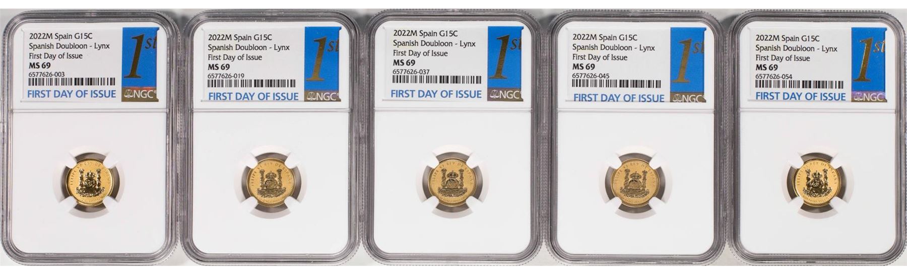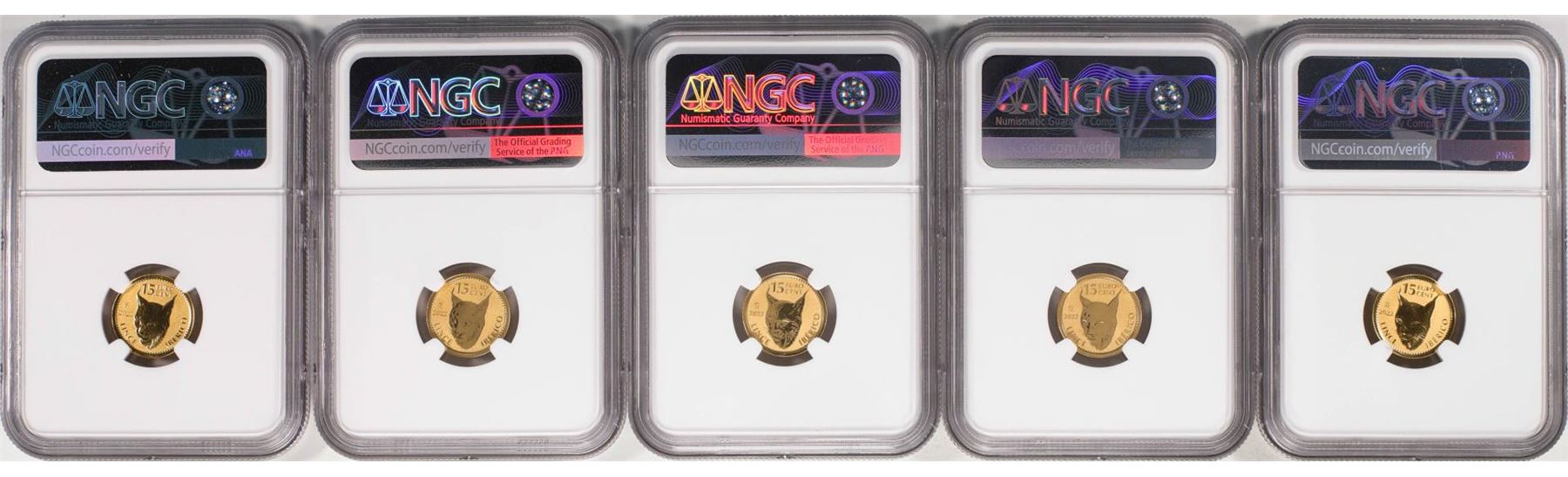 One Lot of (5) 2022M Spain 15 Euro Cent Lynx Gold Doubloon Coins NGC MS69 FDOI. NGC Certified.