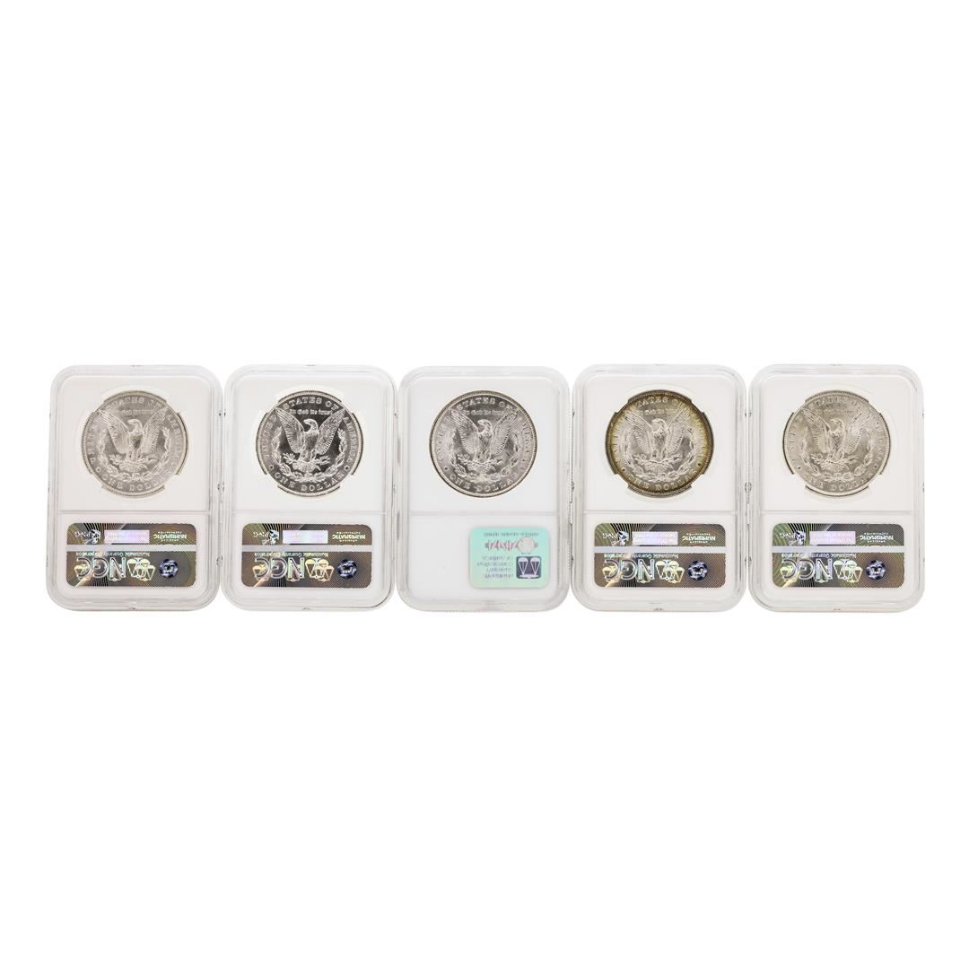 One Lot of (5) Assorted Philadelphia Mint $1 Morgan Silver Dollar Coins NGC MS64. NGC Certified.