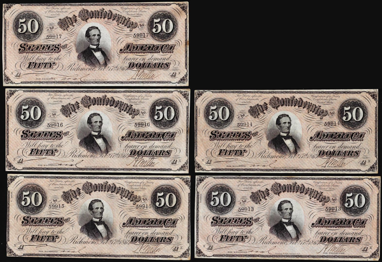 One Lot of (5) Consecutive 1864 $50 Confederate States of America Notes.