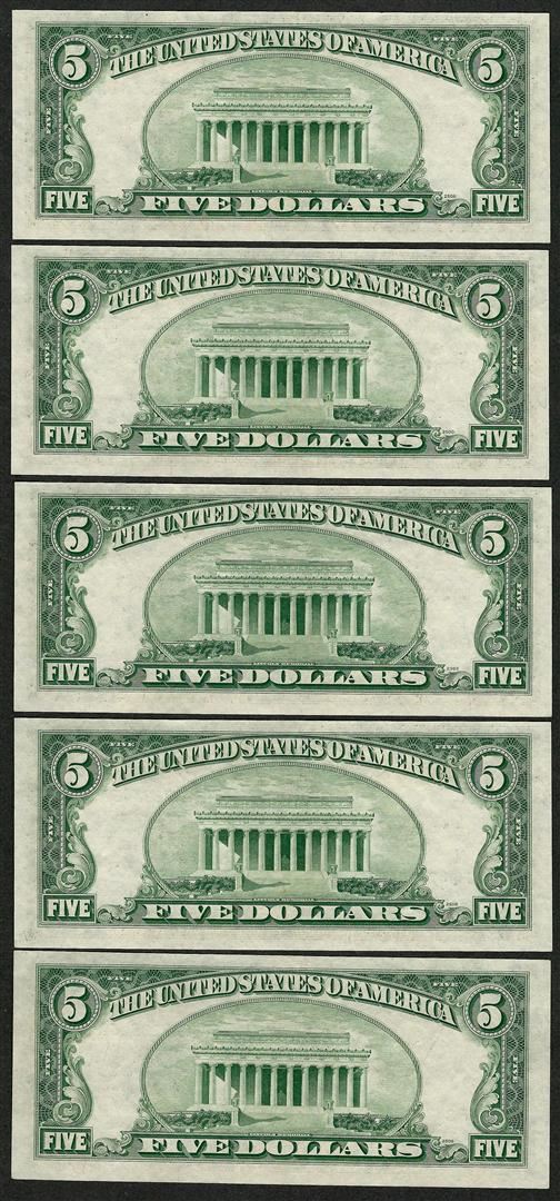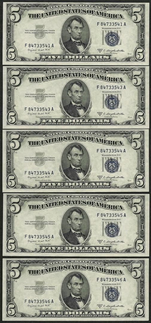 One Lot of (5) Consecutive 1953B $5 Silver Certificate Notes Gem Uncirculated.