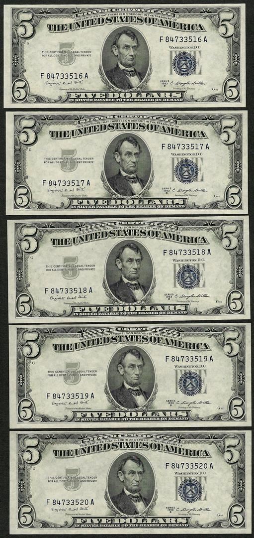 One Lot of (5) Consecutive 1953B $5 Silver Certificate Notes Gem Uncirculated.