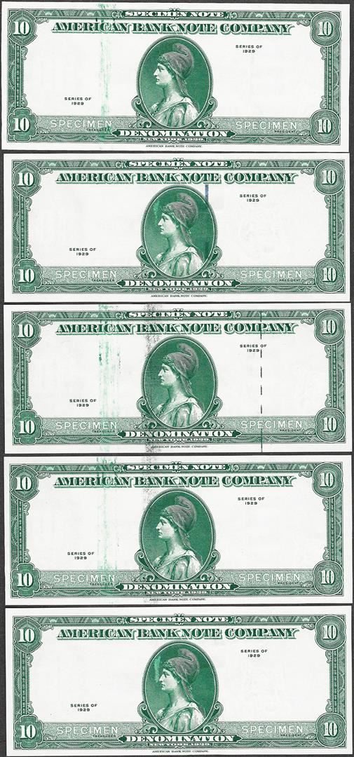 Lot of (5) Different 1929 Ten Unit American Bank Note Company Test Notes