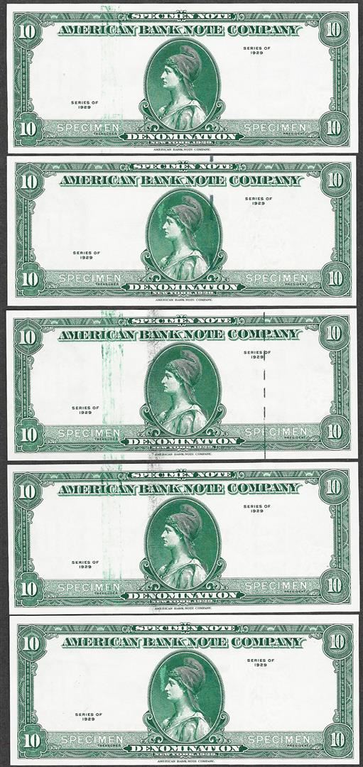 Lot of (5) Different 1929 Ten Unit American Bank Note Company Test Notes