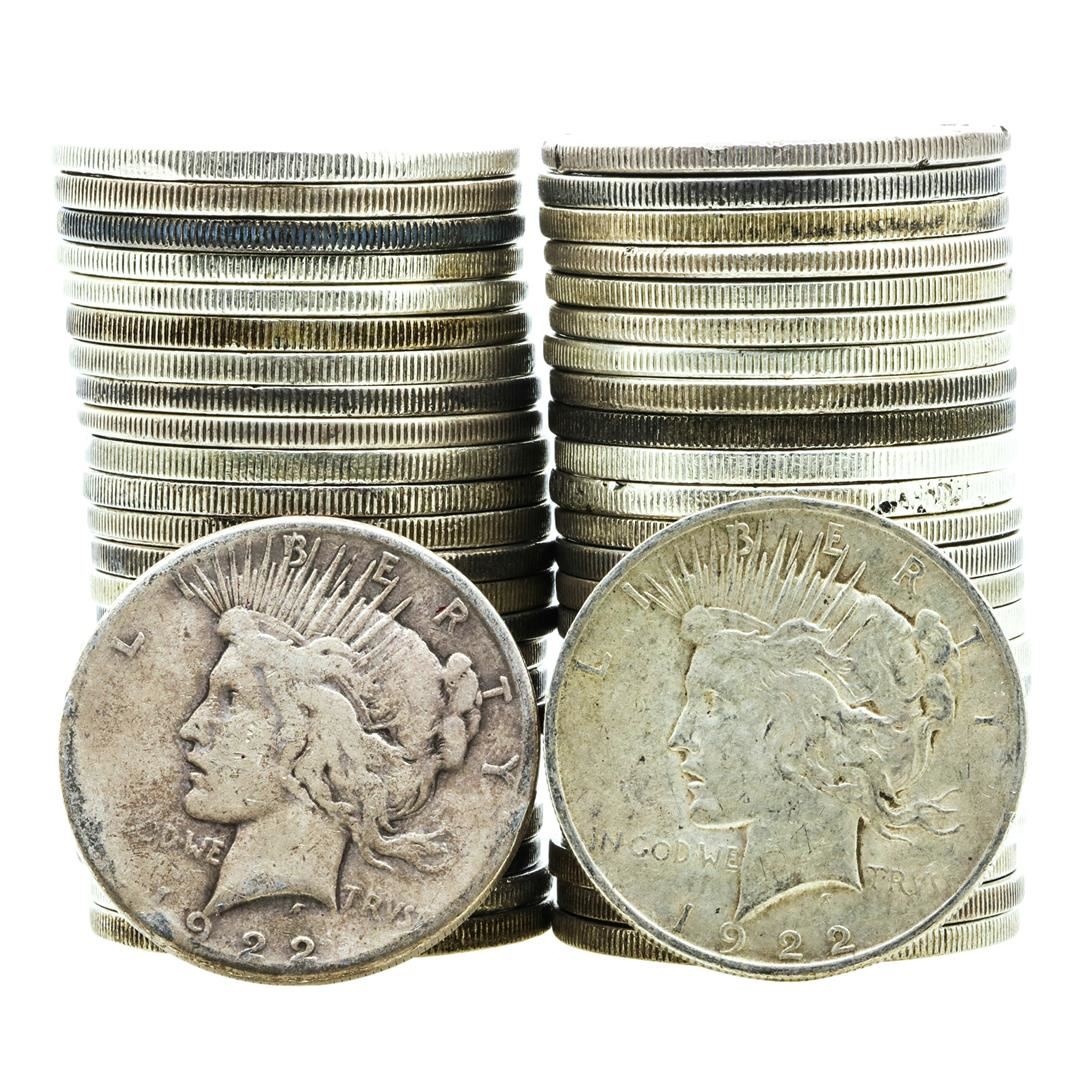 One Lot of (50) $1 Peace Silver Dollar Coins Culls.