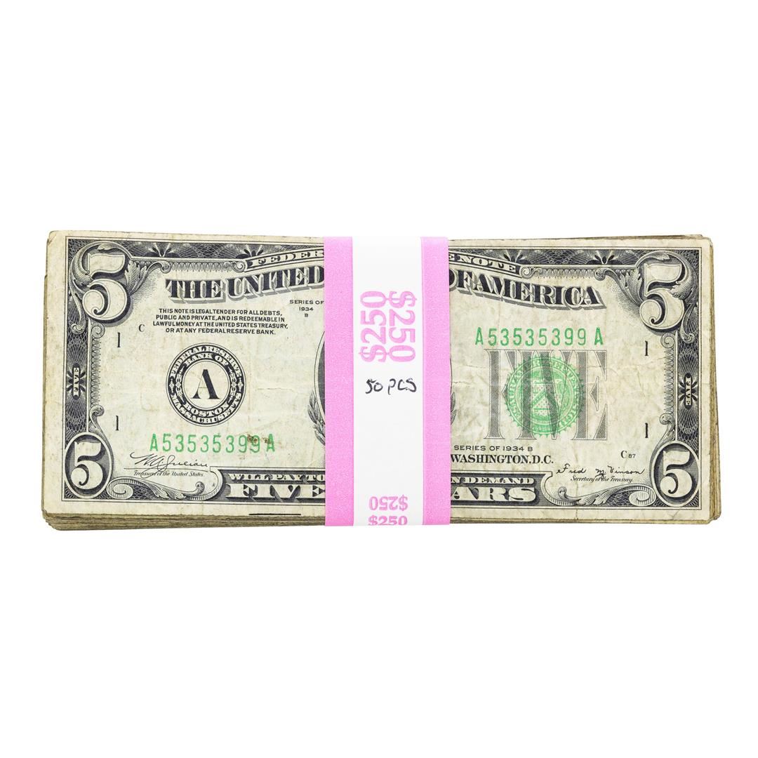 Lot of (50) 1934 $5 Federal Reserve Notes