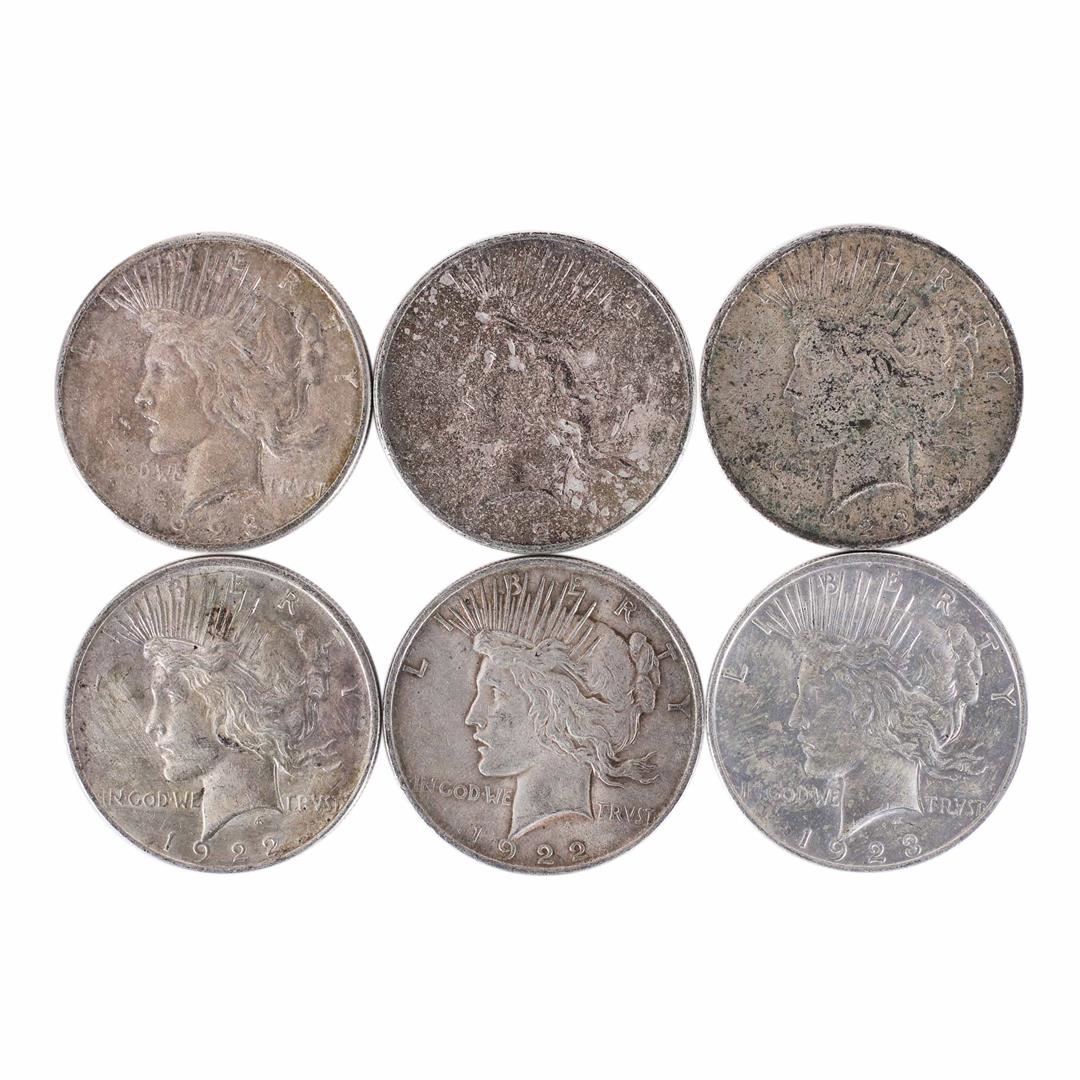 One Lot of (6) $1 Peace Silver Dollar Coins.