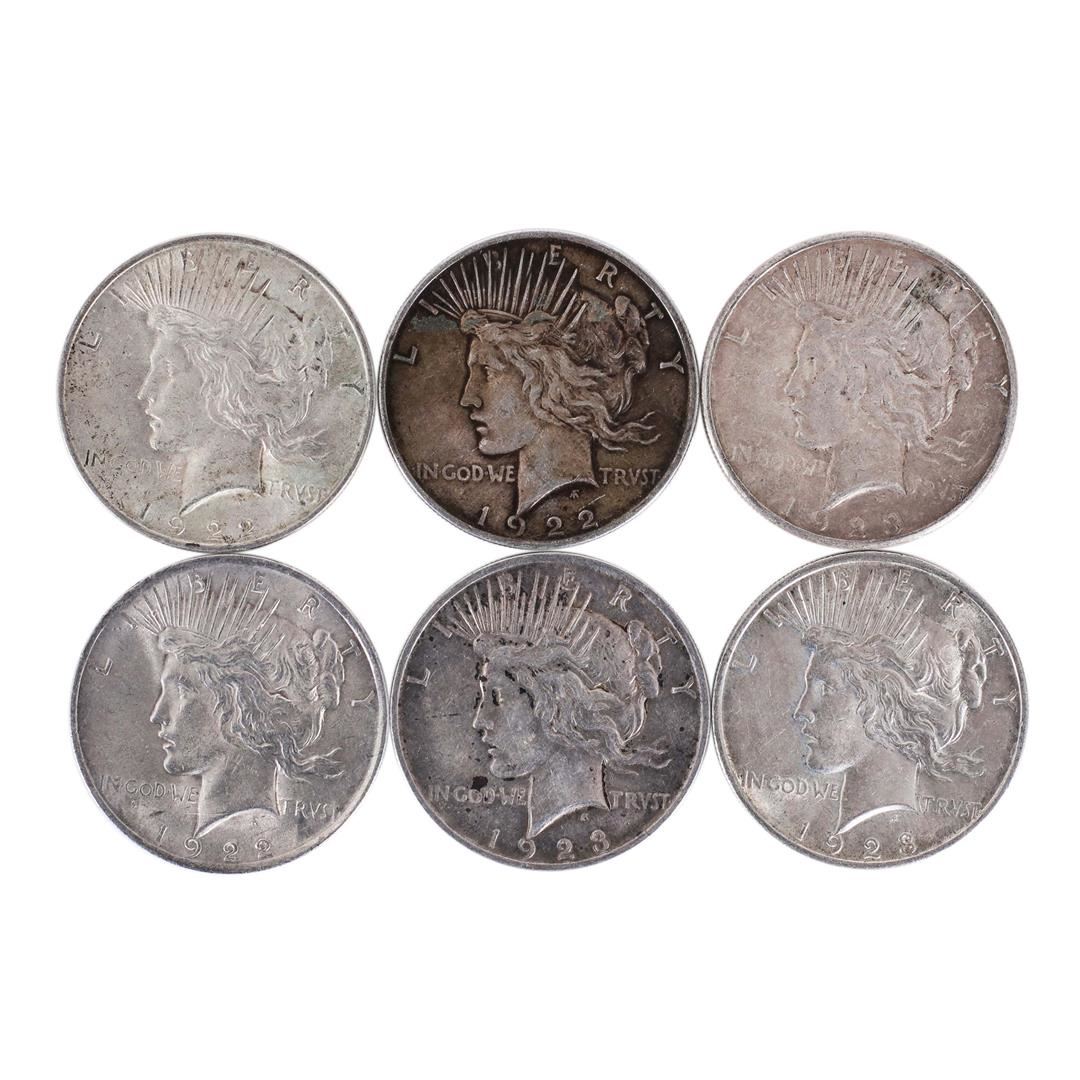 One Lot of (6) $1 Peace Silver Dollar Coins.