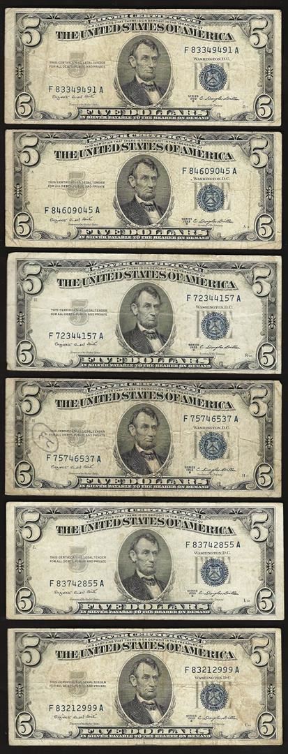 One Lot of (6) 1953B $5 Silver Certificate Notes.