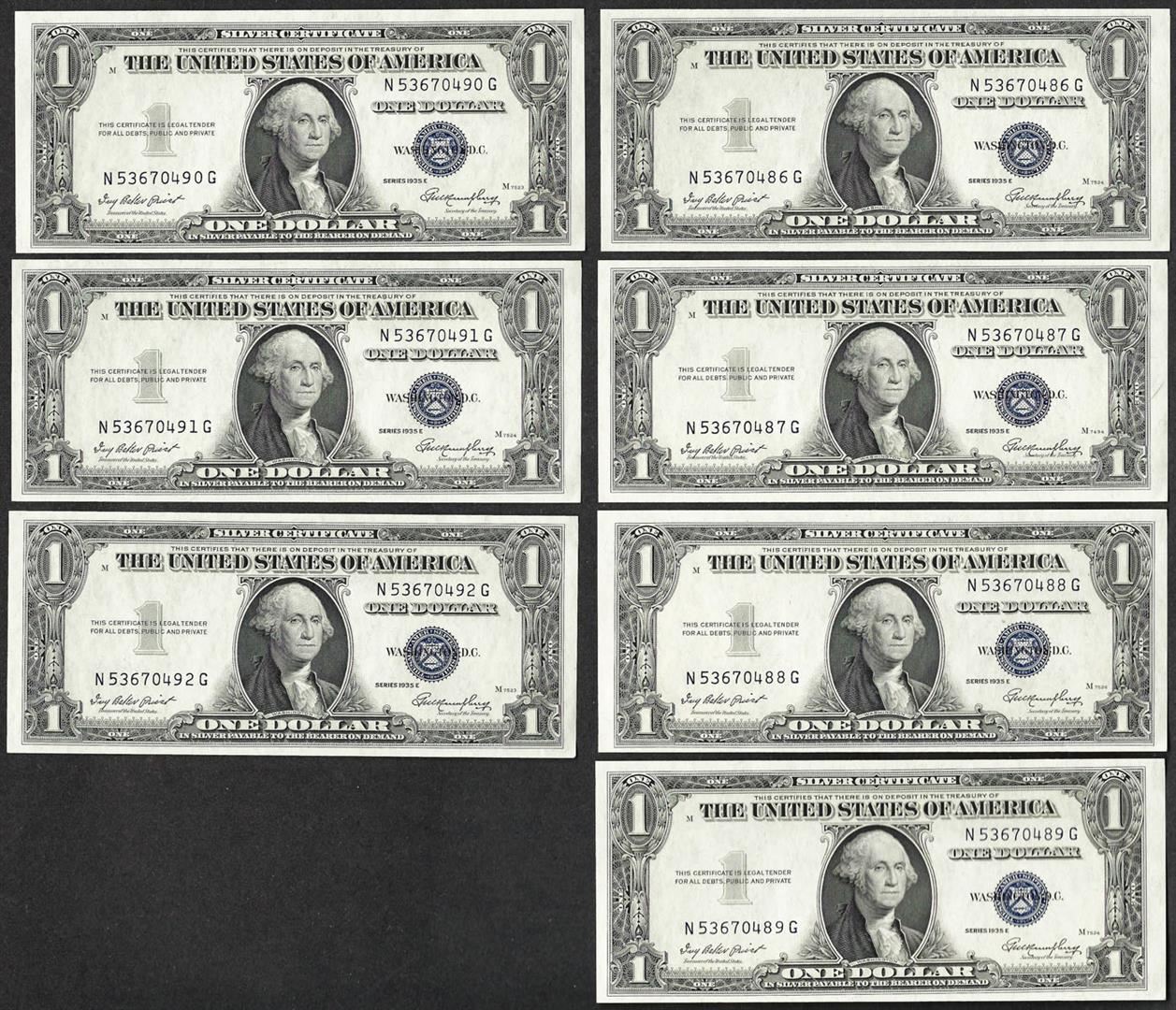 Lot of (7) Consecutive 1935E $1 Silver Certificate Notes