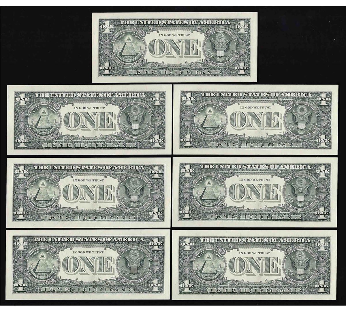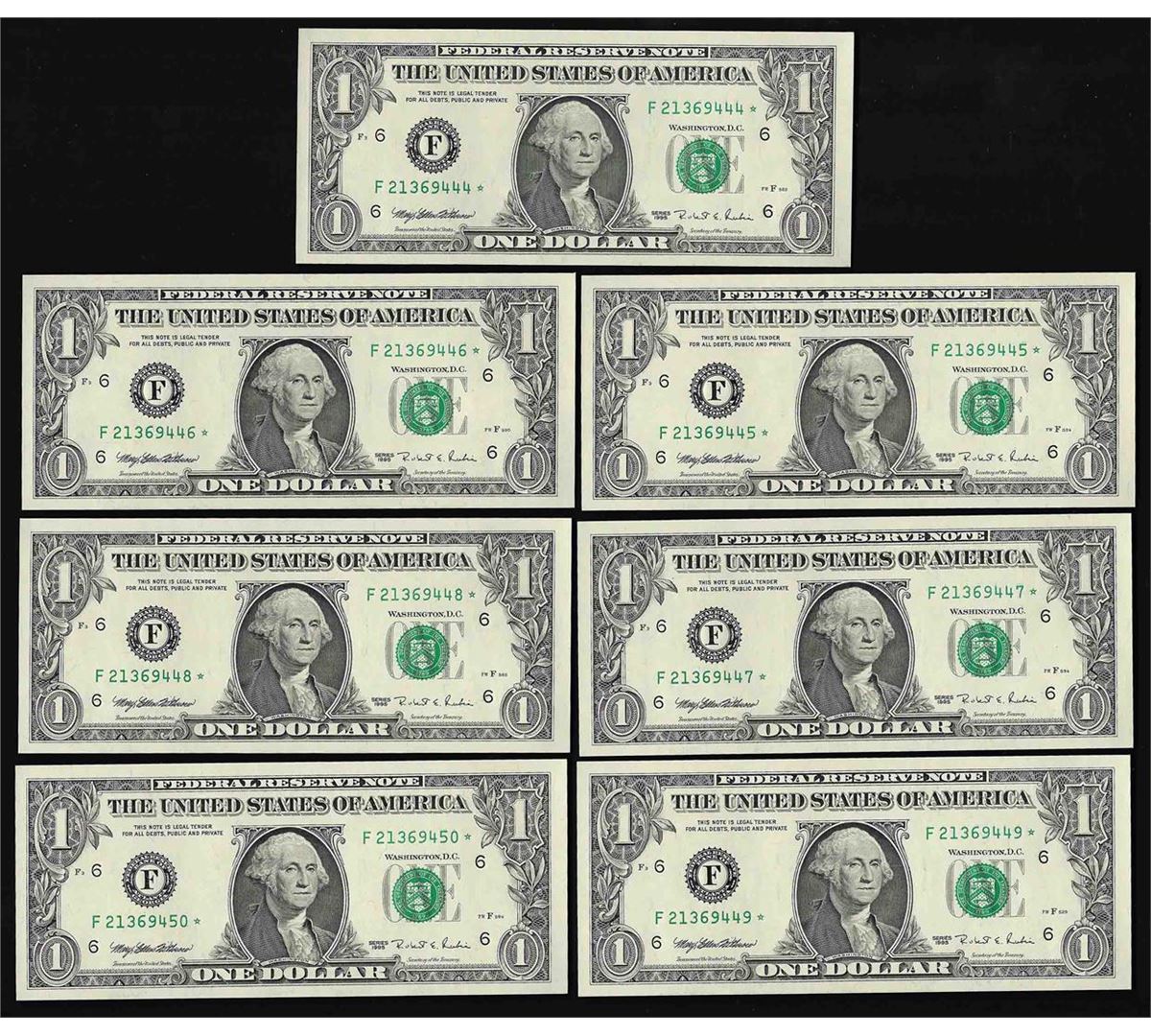 Lot of (7) Consecutive 1995 $1 Federal Reserve STAR Note CU