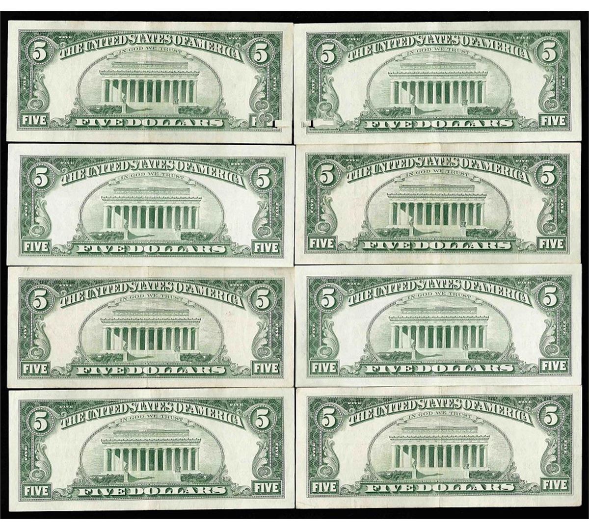 One Lot of (8) 1963 $5 Red Seal Legal Tender Notes.