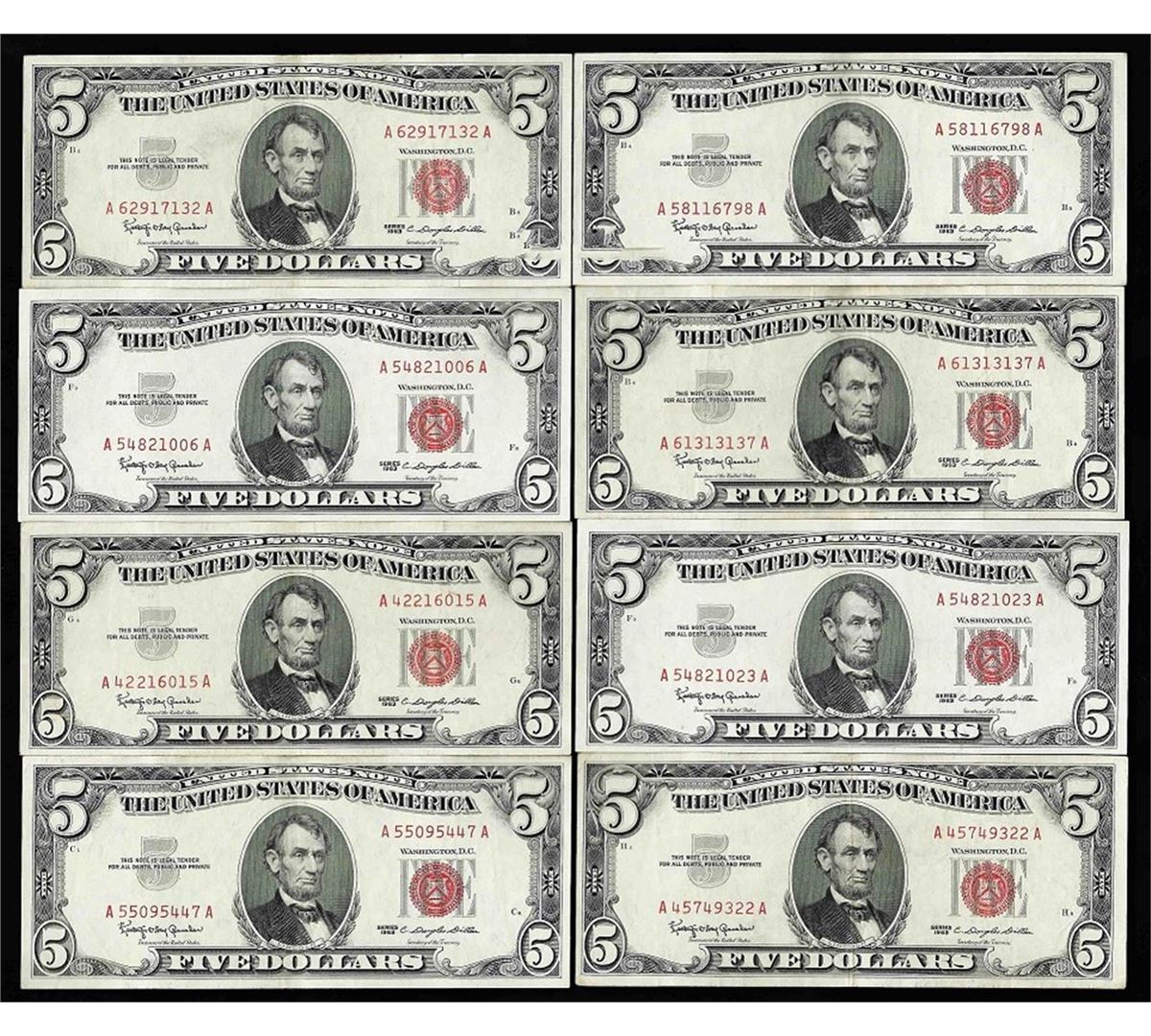 One Lot of (8) 1963 $5 Red Seal Legal Tender Notes.