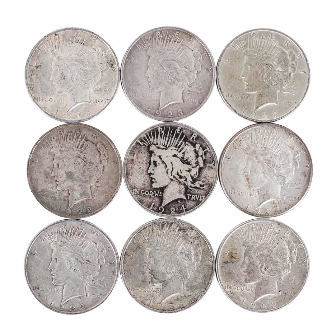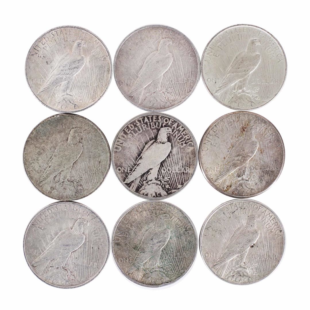 One Lot of (9) $1 Peace Silver Dollar Coins.