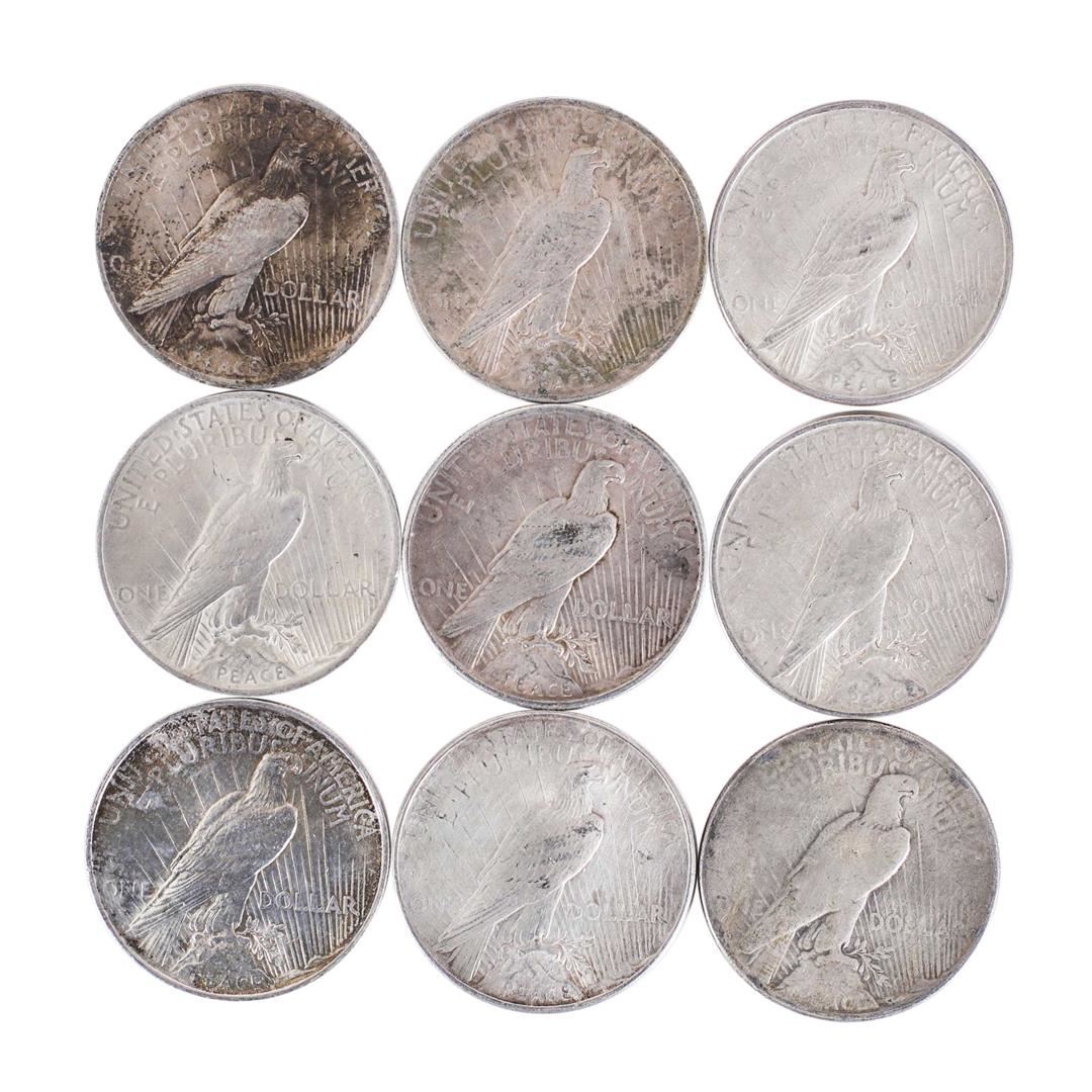 One Lot of (9) $1 Peace Silver Dollar Coins.
