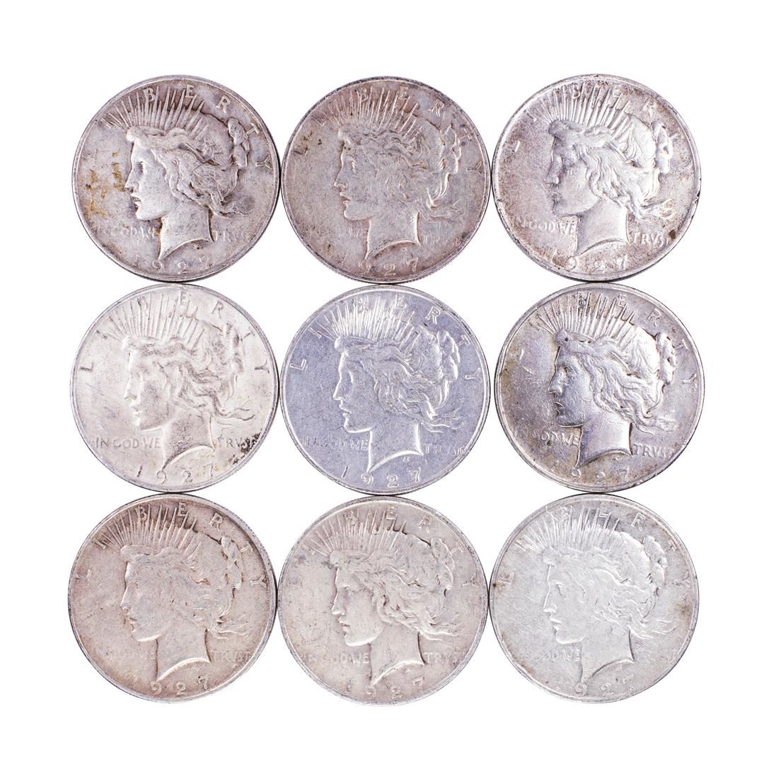 One Lot of (9) 1927-D $1 Peace Silver Dollar Coins.