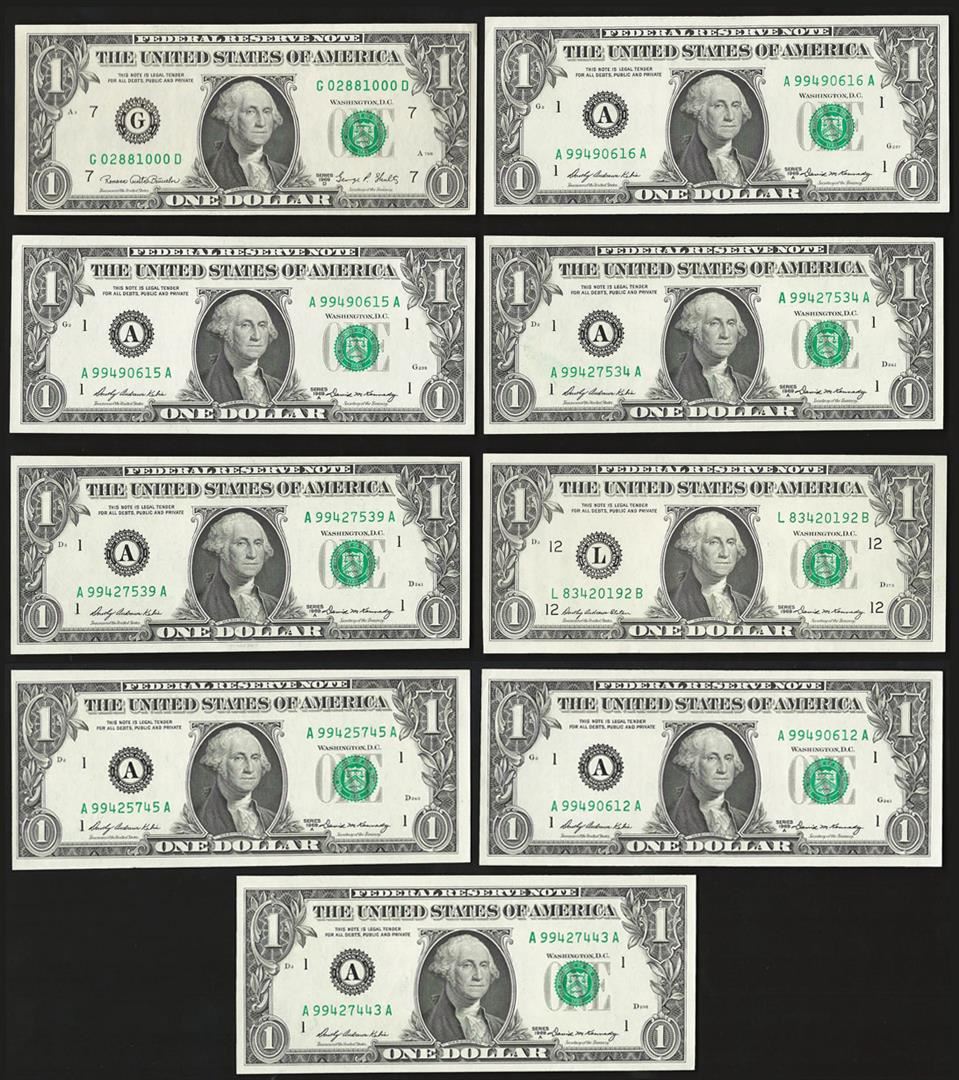 One Lot of (9) 1969 $1 Federal Reserve Notes Uncirculated.