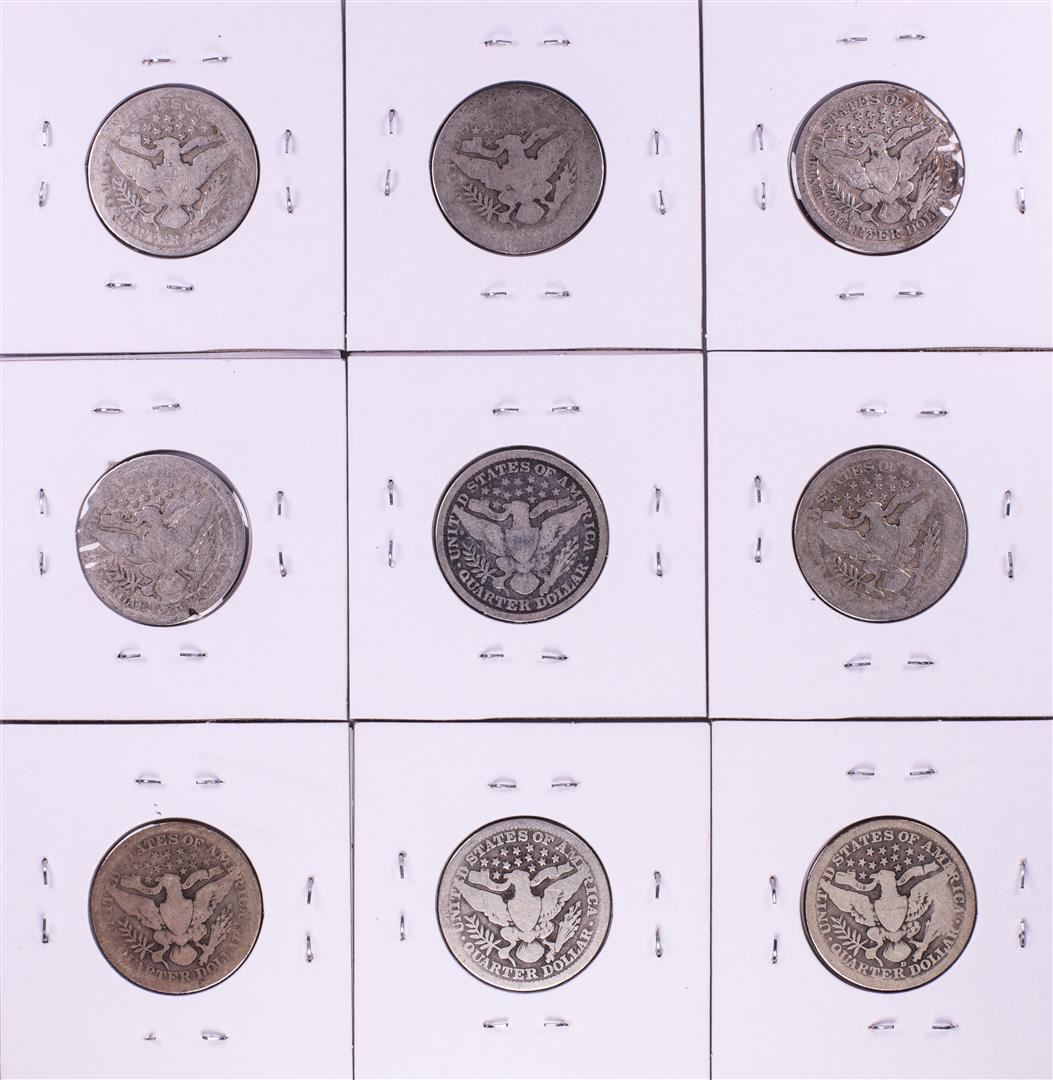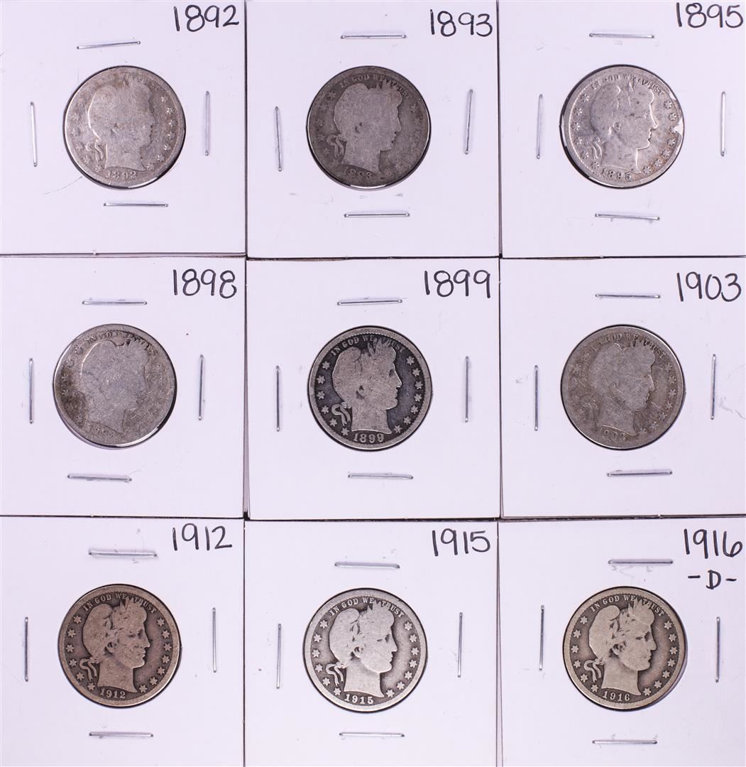 One Lot of (9) Miscellaneous Date Barber Quarter Coins.