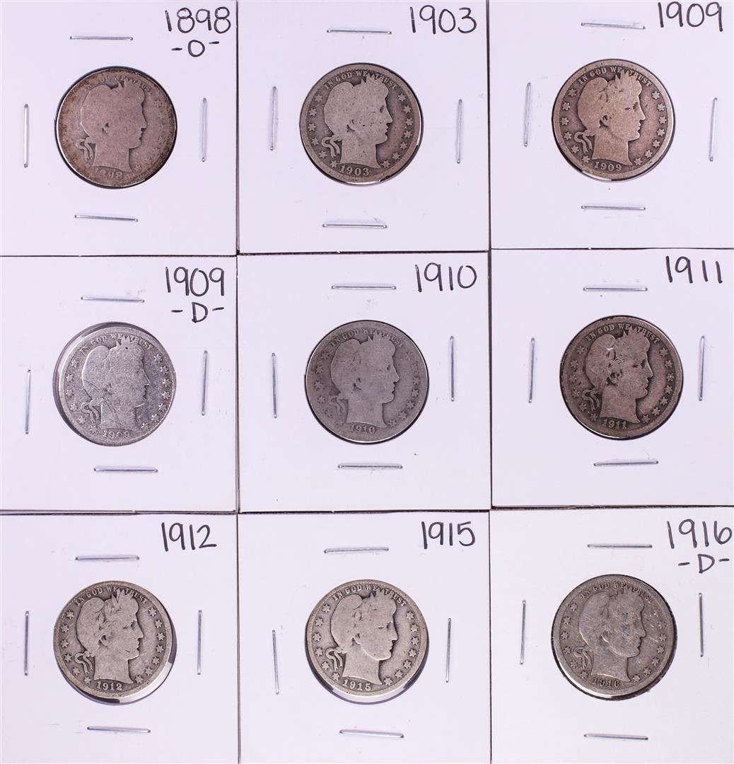 One Lot of (9) Miscellaneous Date Barber Quarter Coins.
