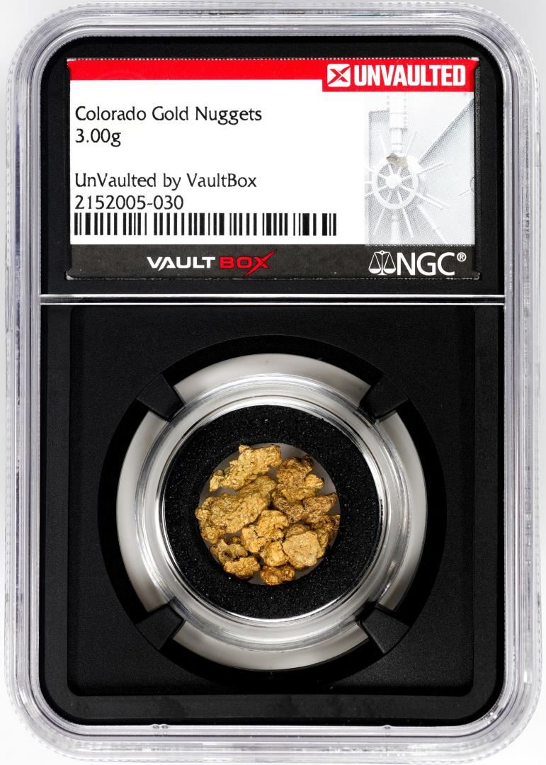 One Lot of Colorado Gold Nuggets 3.00 Grams Total Weight NGC Vaultbox Unvaulted. NGC Certified.