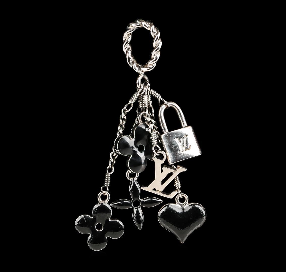 Authentic Louis Vuitton Charm Pendant featuring enamel Louis Vuitton flower charms, a black enamel heart charm, a silver-tone LV logo charm and a silver-tone LV lock charm. This charm pendant can be worn on the included black leather cord as a necklace or bracelet or can be worn on various chains in your jewelry collection. Pendant and leather cord are in good used condition. Please see pictures before bidding. This item comes complete with Louis Vuitton dust bag, Louis Vuitton box and Louis Vuitton Bijoux Fantaisie booklet.