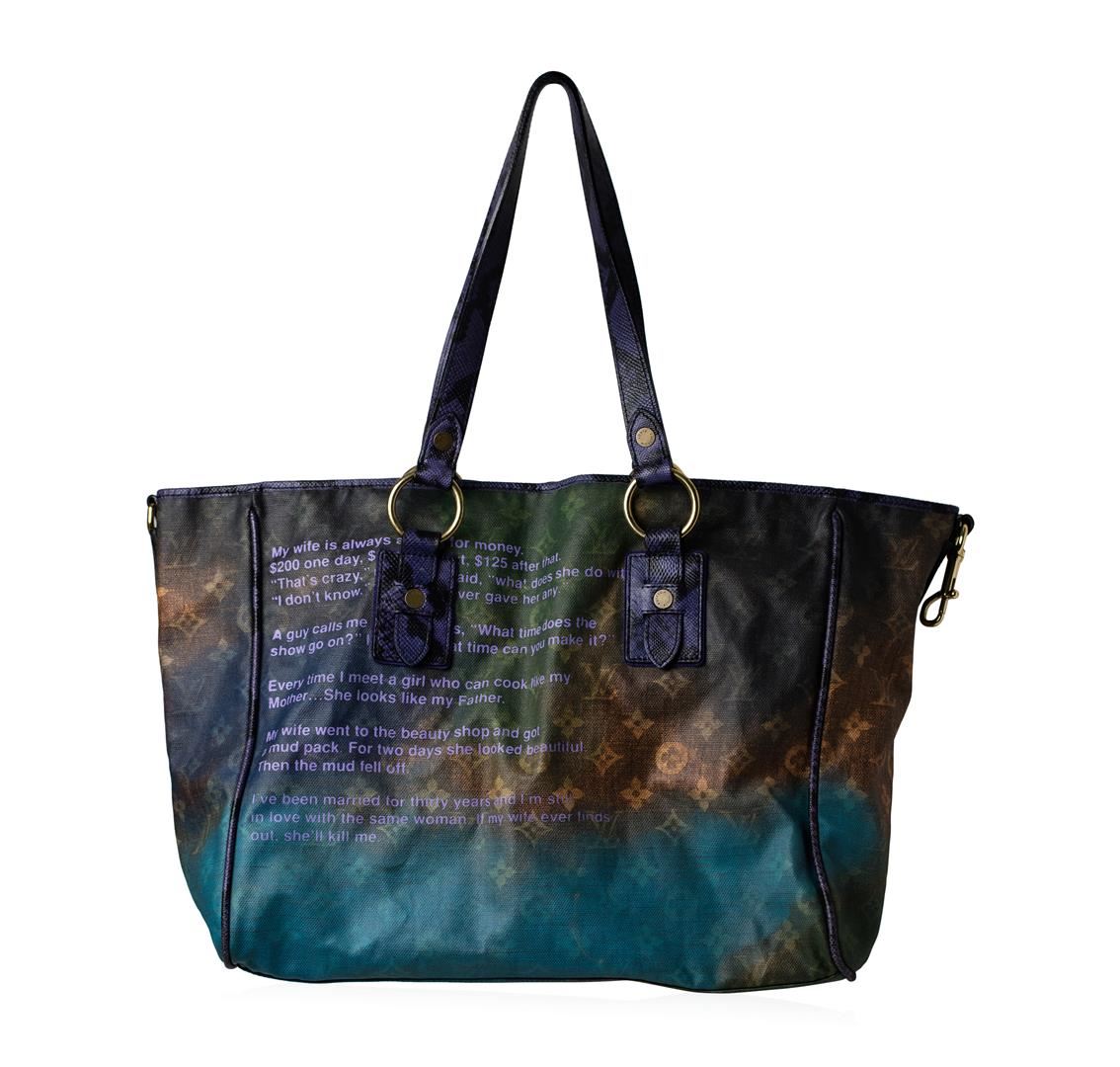 Authentic Louis Vuitton Richard Prince Heartbreak Jokes Tote Bag. This limited edition bag, originally released in 2008, is a true collectors piece of art. The combination of acid colors on monogram canvas make this a one of a kind handbag. The stylish tote comes in a combination of blue, green, purple and orange colors with long purple snake print leather shoulder straps and a small printed line of jokes on one side with polished brass hardware. Large, open microfiber lined interior which makes this bag perfect for everyday use or travel. This bag has been kept in good condition with some signs of wear, (please see photos). Included with this item: Louis Vuitton dust bag. Approximate Measurements: 22" L x 7.5" W x 13.75" H - 16" base length and 11" interior depth.