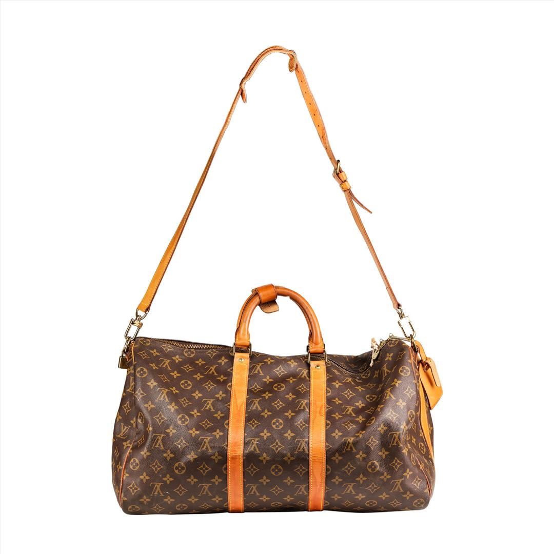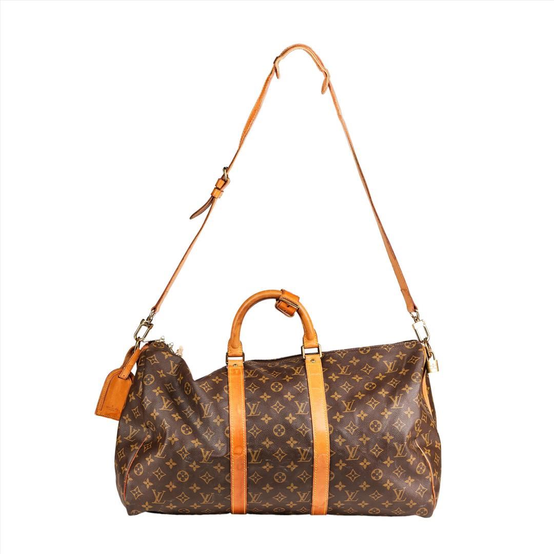 This 100% Authentic Louis Vuitton Keepall Bandouliere 50 is the perfect travel companion. It features brass hardware, tan vachetta leather accents, dual rolled top handles, brown canvas lining and zip closure at top. Complete with an adjustable shoulder strap and luggage hang tag. Date code reads FH0920. Great used condition with signs of wear throughout including stains and cracks on the leather trim. Interior has a few stains as well. Please see photos. Approximate dimensions: 19.7 in x 11.4 in x 8.7 in