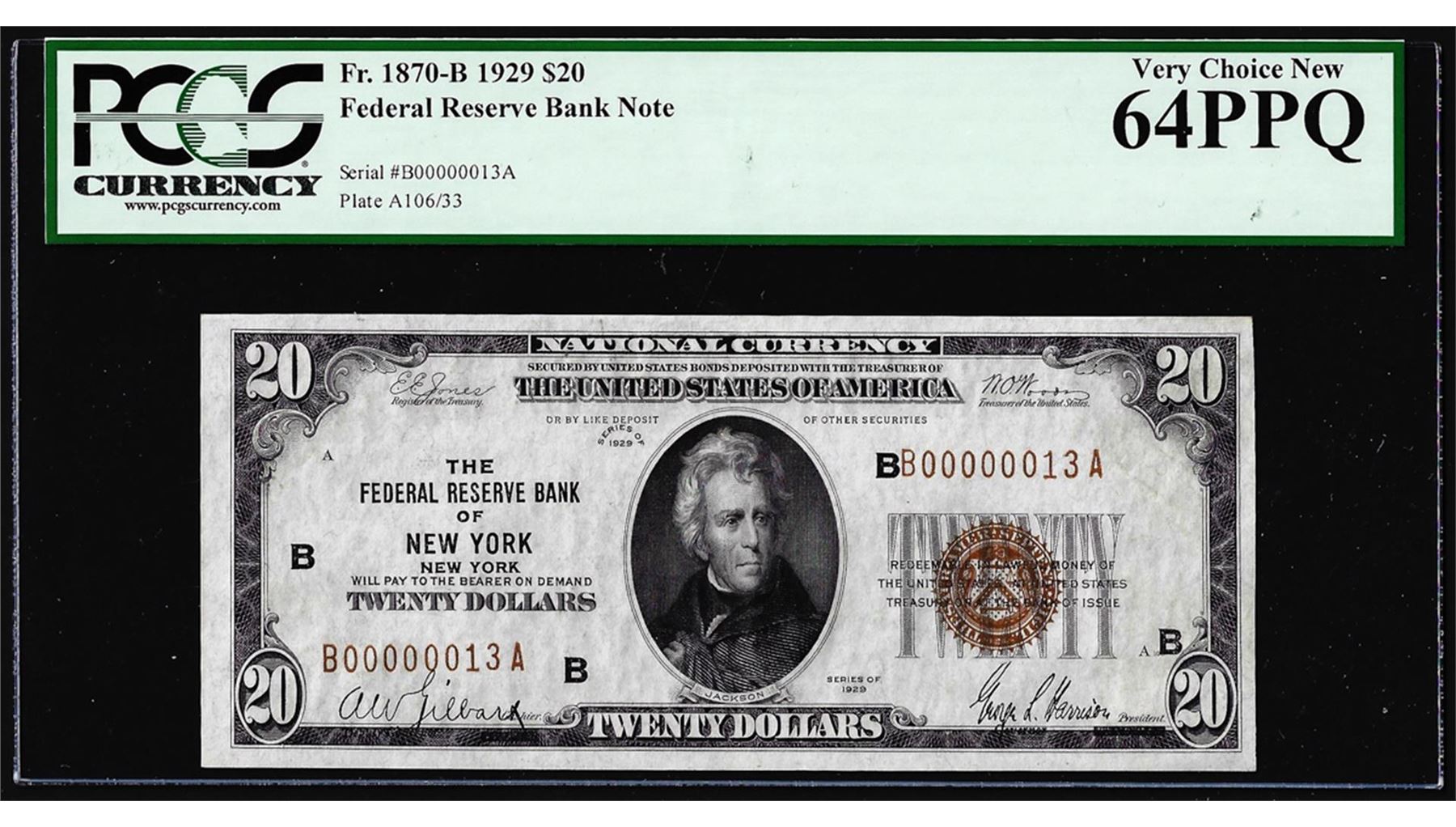 Low Serial #13 - 1929 $20 Federal Reserve Bank Note New York PCGS Very Choice New 64PPQ