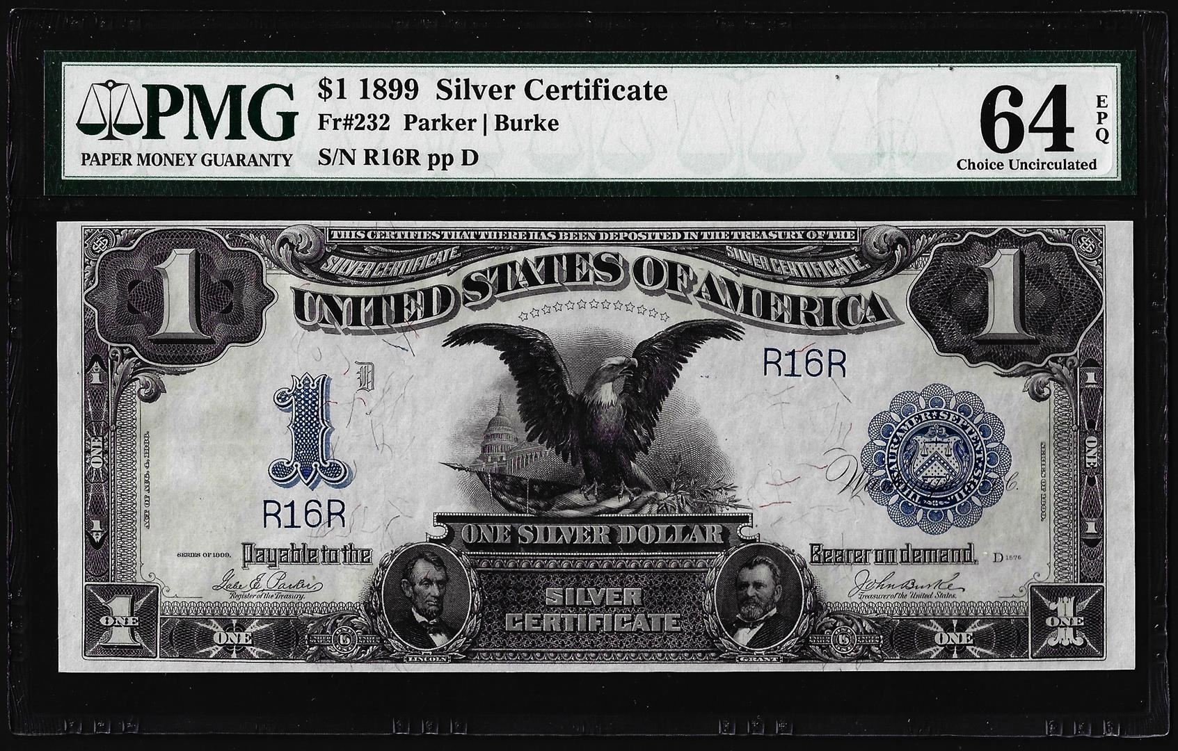 One Low Serial # 1899 $1 Black Eagle Silver Certificate Note PMG Choice Uncirculated 64EPQ. PMG Certified.