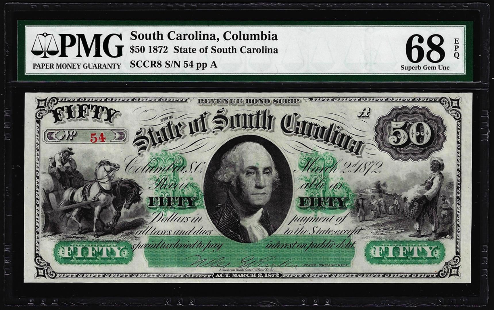 One Low Serial Number 1872 $50 South Carolina Obsolete Note PMG Superb Gem Unc. 68EPQ. PMG Certified.