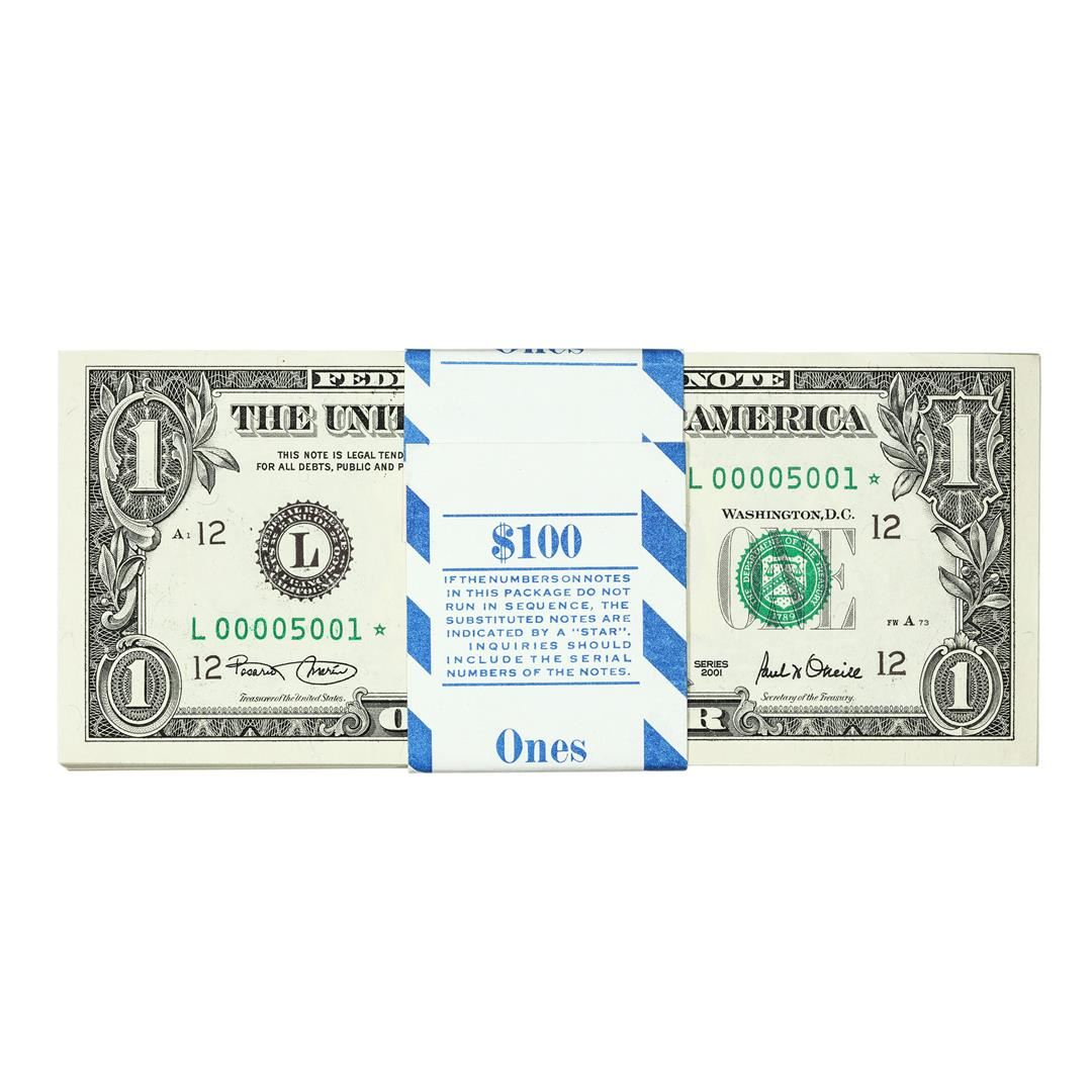 Low Serial Number Pack of (100) Consecutive 2001 $1 Federal Reserve STAR Notes
