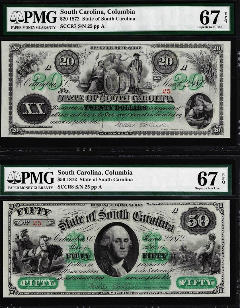 One Low Serial Set 1872 $20 & $50 South Carolina Obsolete Notes PMG Superb Gem Unc. 67EPQ. PMG Certified.