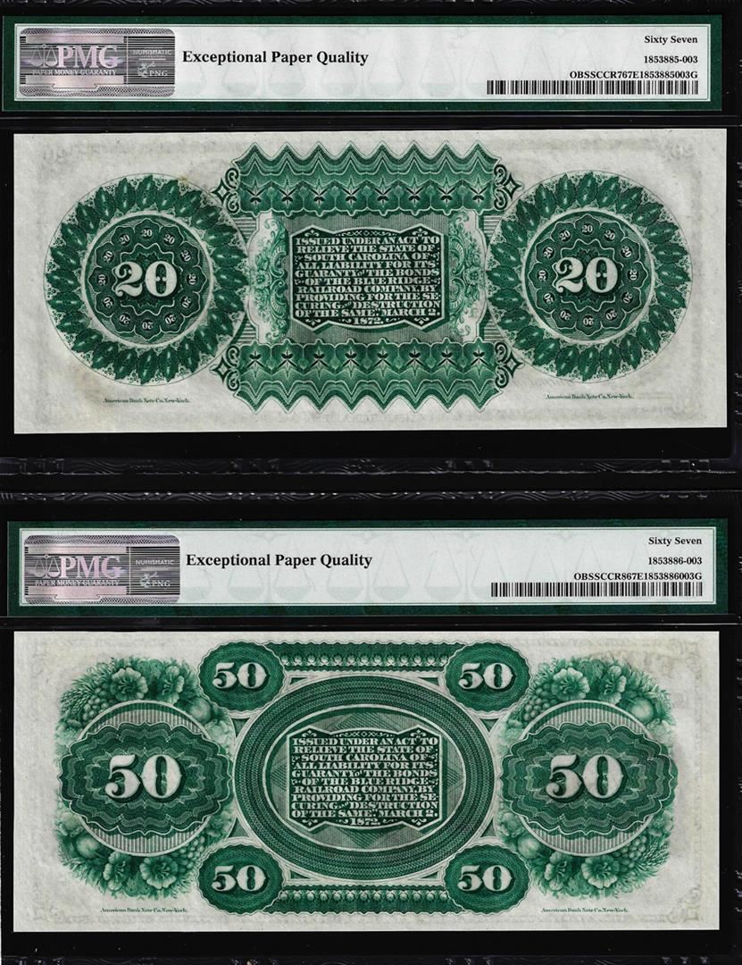 One Low Serial Set 1872 $20 & $50 South Carolina Obsolete Notes PMG Superb Gem Unc. 67EPQ. PMG Certified.