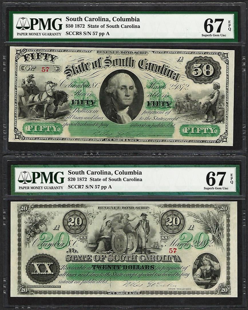Low Serial Set 1872 $20 & $50 South Carolina Obsolete Notes PMG Superb Gem Unc. 67EPQ