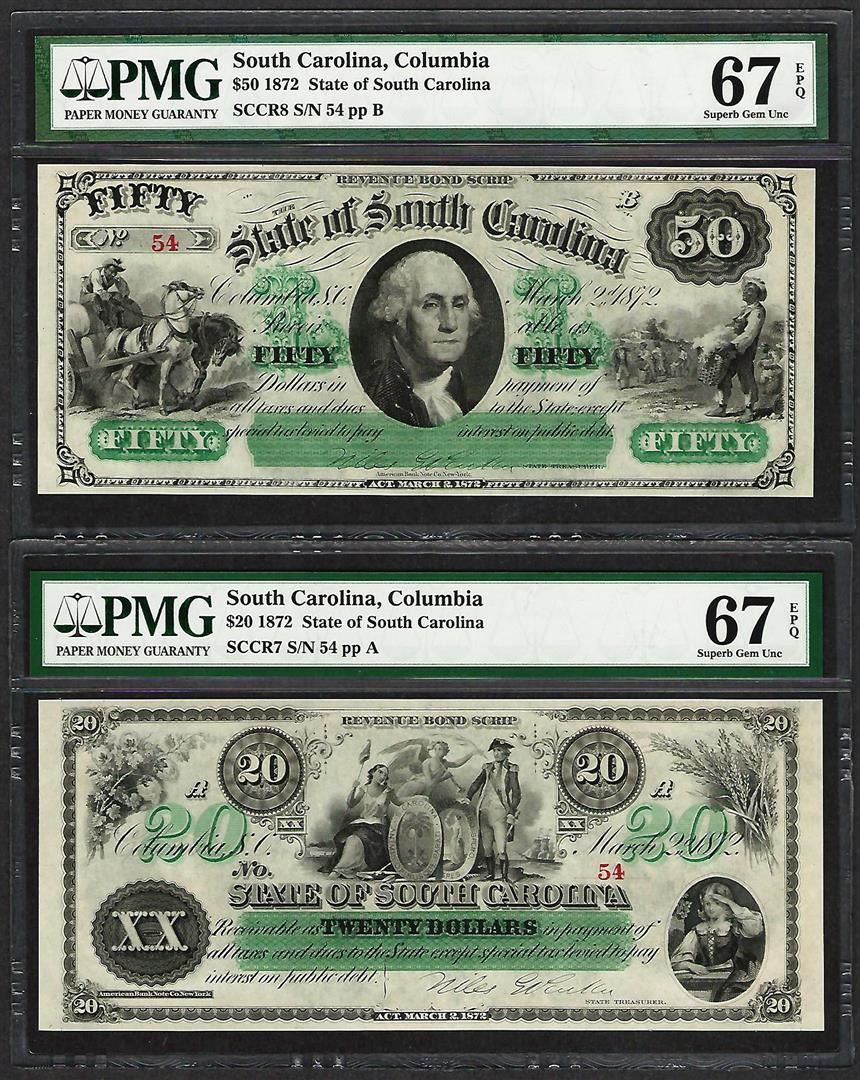 Low Serial Set 1872 $20 & $50 South Carolina Obsolete Notes PMG Superb Gem Unc. 67EPQ