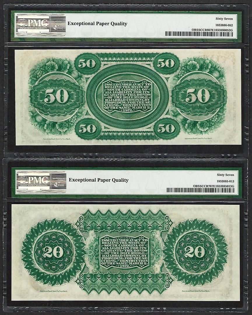 One Low Serial Set 1872 $20 & $50 South Carolina Obsolete Notes PMG Superb Gem Unc. 67EPQ.