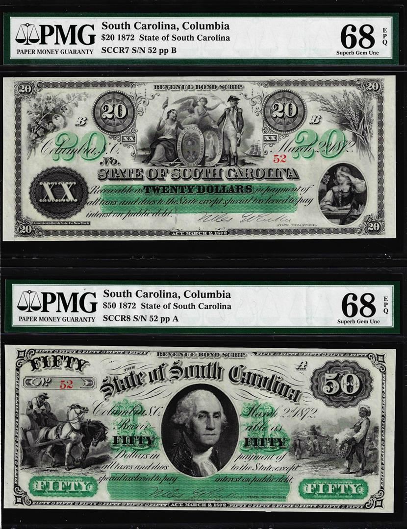 One Low Serial Set 1872 $20 & $50 South Carolina Obsolete Notes PMG Superb Gem Unc. 68EPQ. PMG Certified.