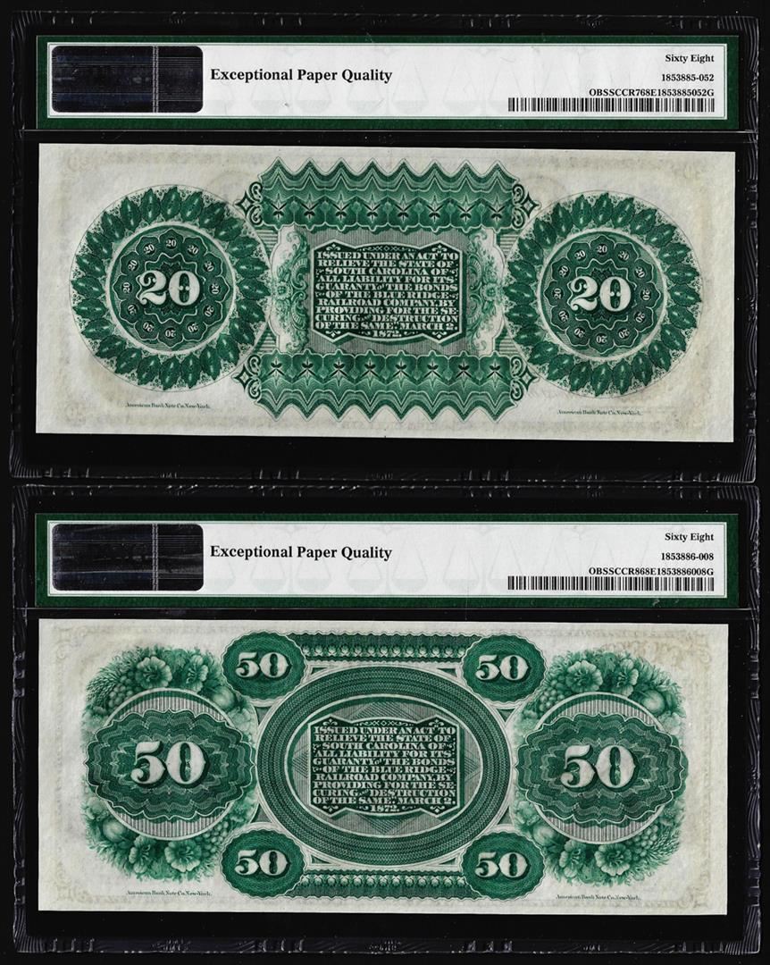 One Low Serial Set 1872 $20 & $50 South Carolina Obsolete Notes PMG Superb Gem Unc. 68EPQ. PMG Certified.