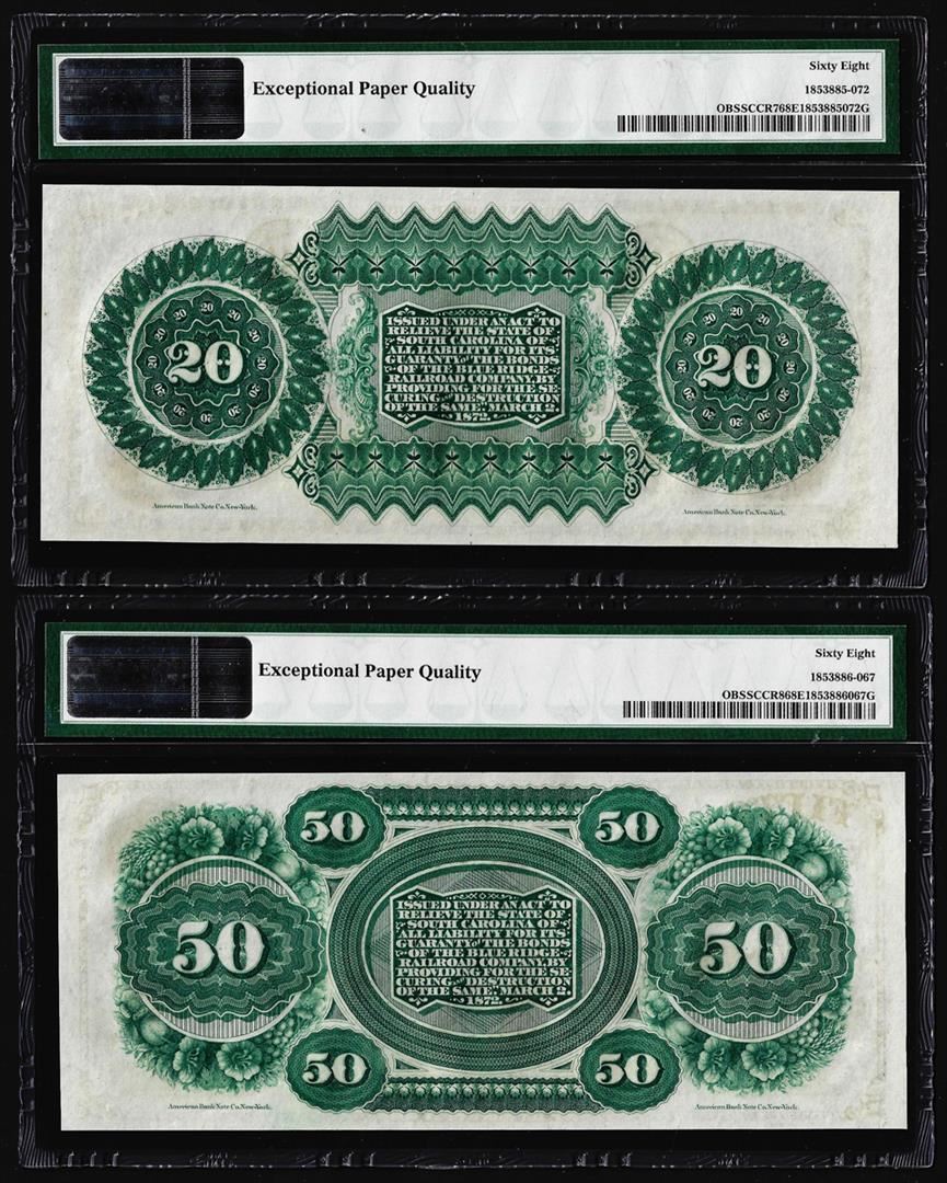 One Low Serial Set 1872 $20 & $50 South Carolina Obsolete Notes PMG Superb Gem Unc. 68EPQ. PMG Certified.