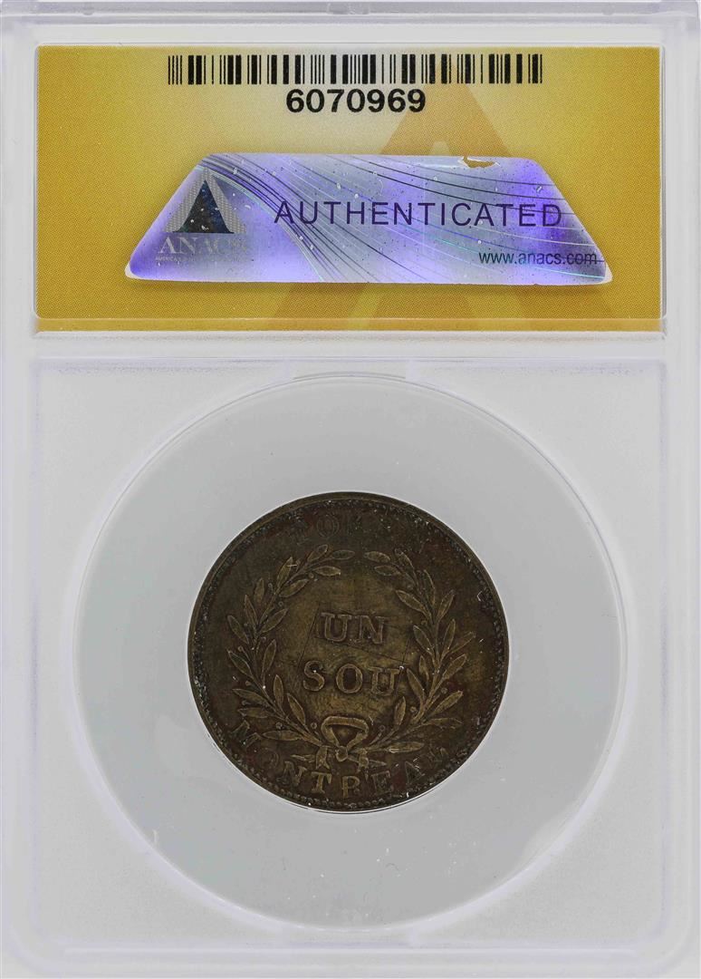 One Lower Canada Montreal Un Sou Token ANACS VF35 Details. ANACS Certified.