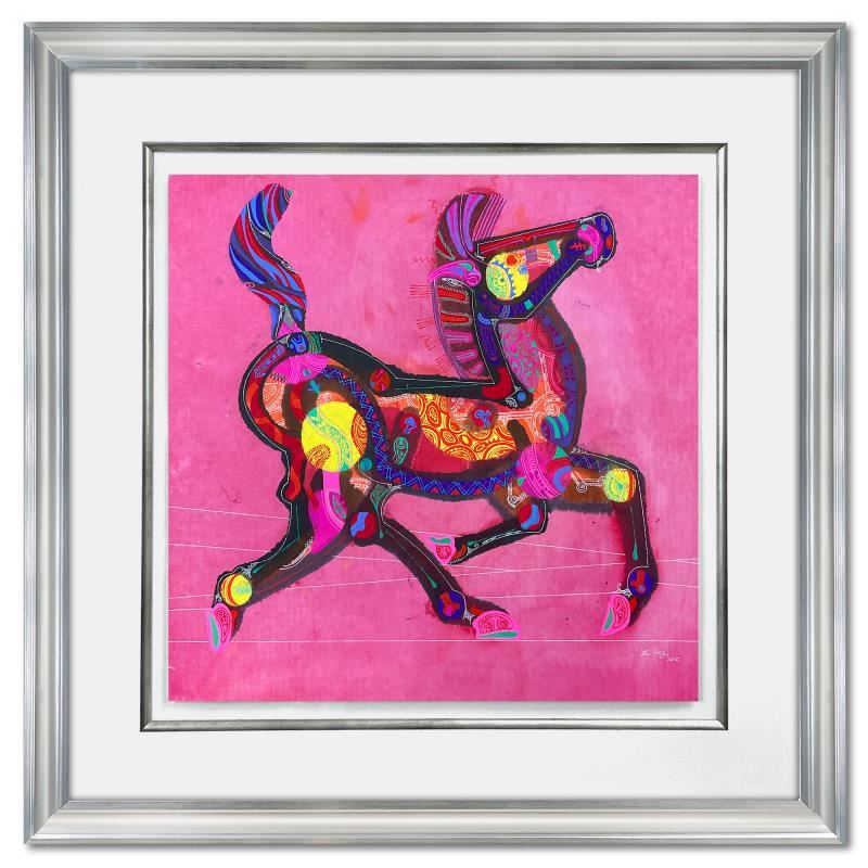 "Chinese Zodiac - Metal Horse" is an original mixed media painting on paper by Lu Hong, hand signed by the artist. This piece comes custom framed. Includes Letter of Authenticity. Measures approx. 31" x 31.5" (frame), 20" x 20" (image).