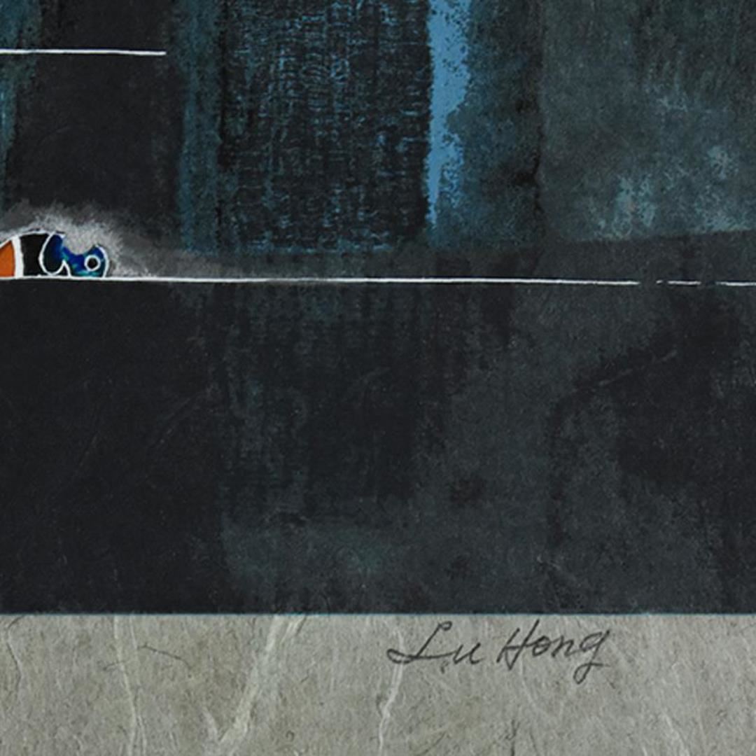 "Nocturne" is a limited edition serigraph on rice paper by Lu Hong, numbered L/C and hand signed by the artist. Includes Letter of Authenticity. Measures approx. 34" x 35" (border), 29" x 29" (image). Please note: There is minor wear in the border area and a small scuff on the bottom-left corner that is only visible upon close inspection.