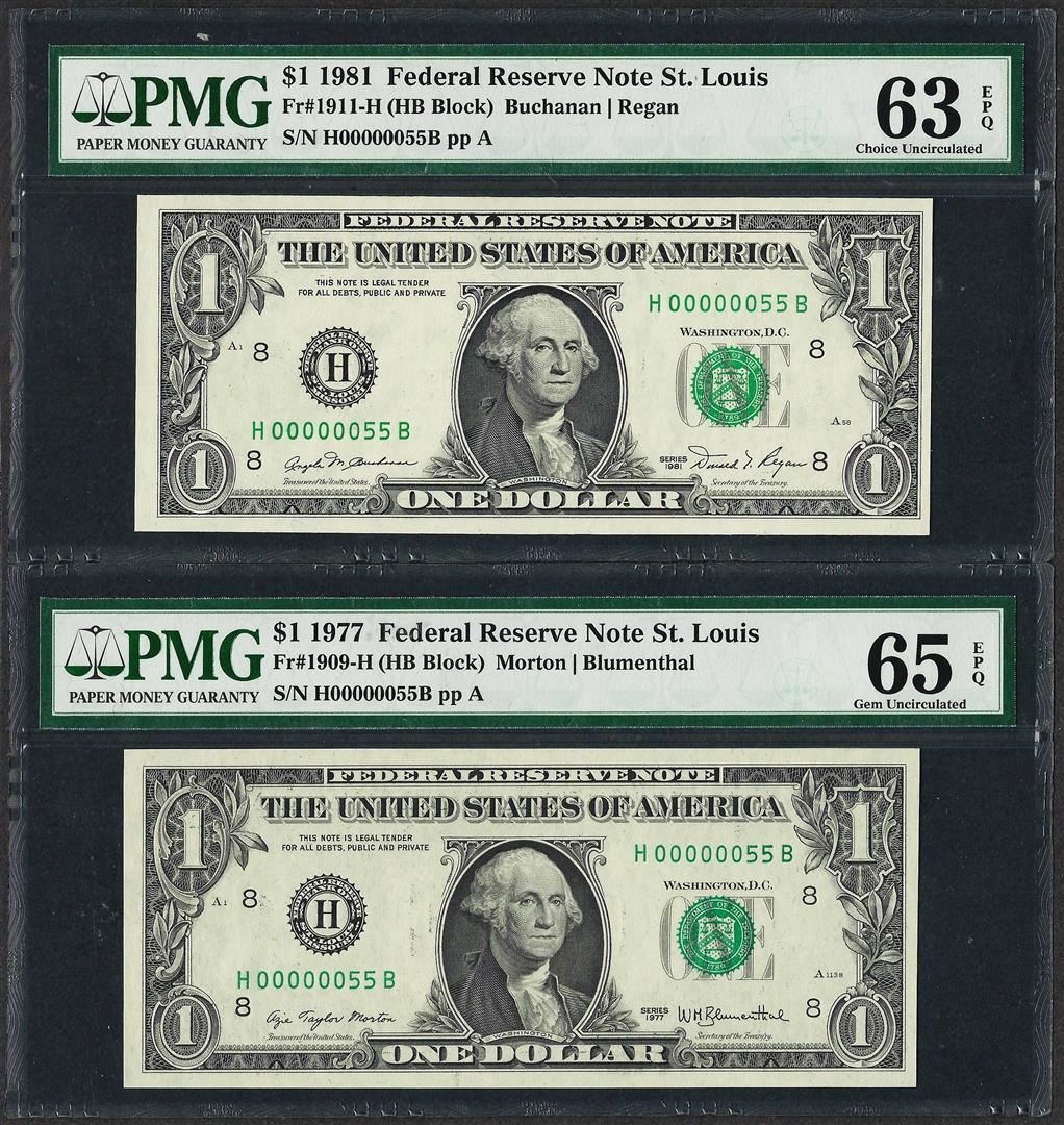 MATCHING LOW SERIAL NUMBERS 1977 & 1981 $1 Federal Reserve Notes PMG Unc. 63/65E
