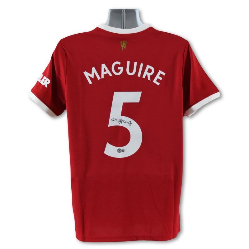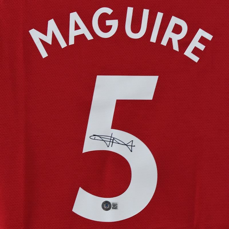 This is a replica Manchester United F.C. (Home) jersey soccer jersey autographed by Harry Maguire. This piece is presented with a Certificate of Authenticity from Beckett with a QR code and certification number. Measures approx. 30" x 28" (jersey).