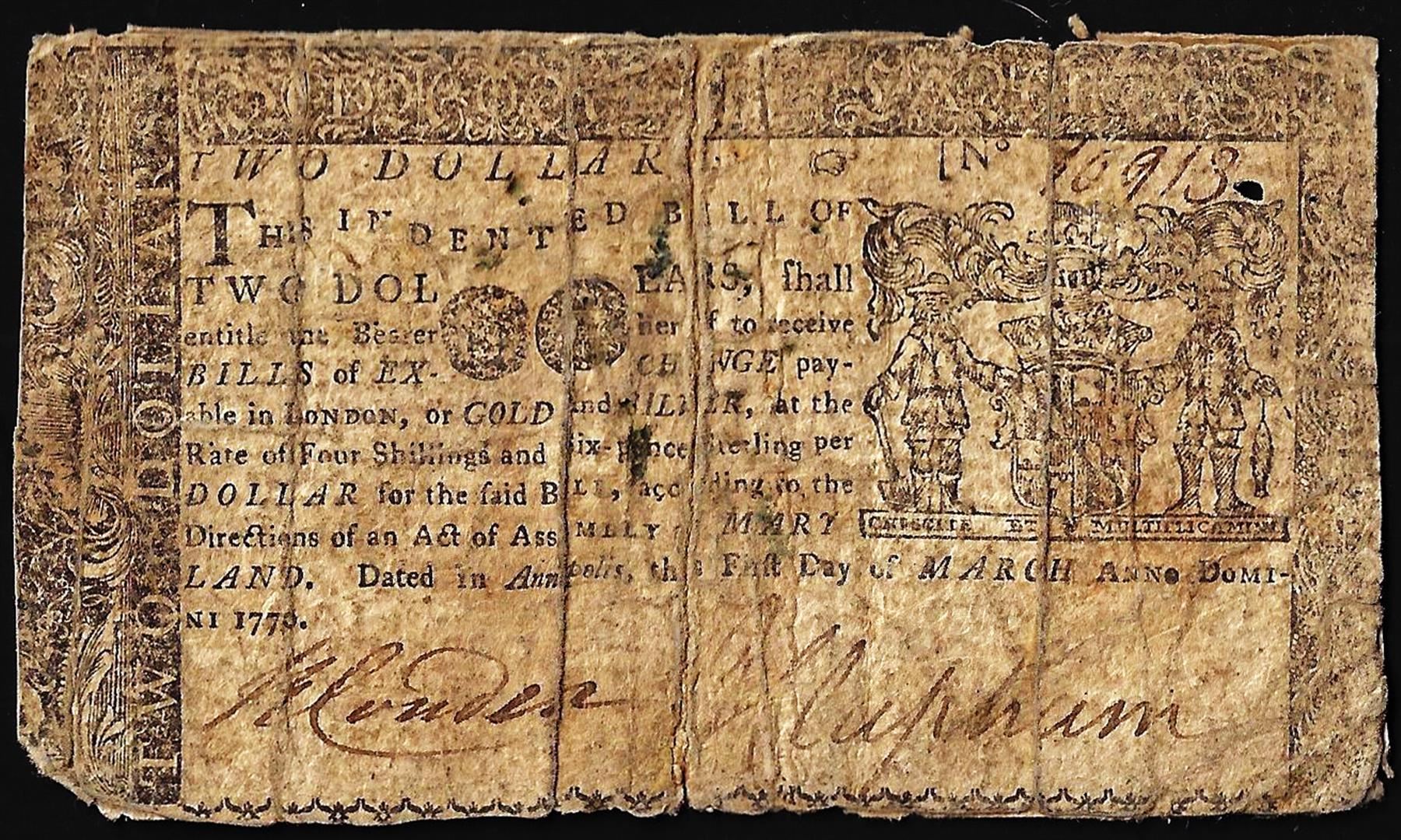 One March 1, 1770 $2 Maryland Colonial Currency Note.