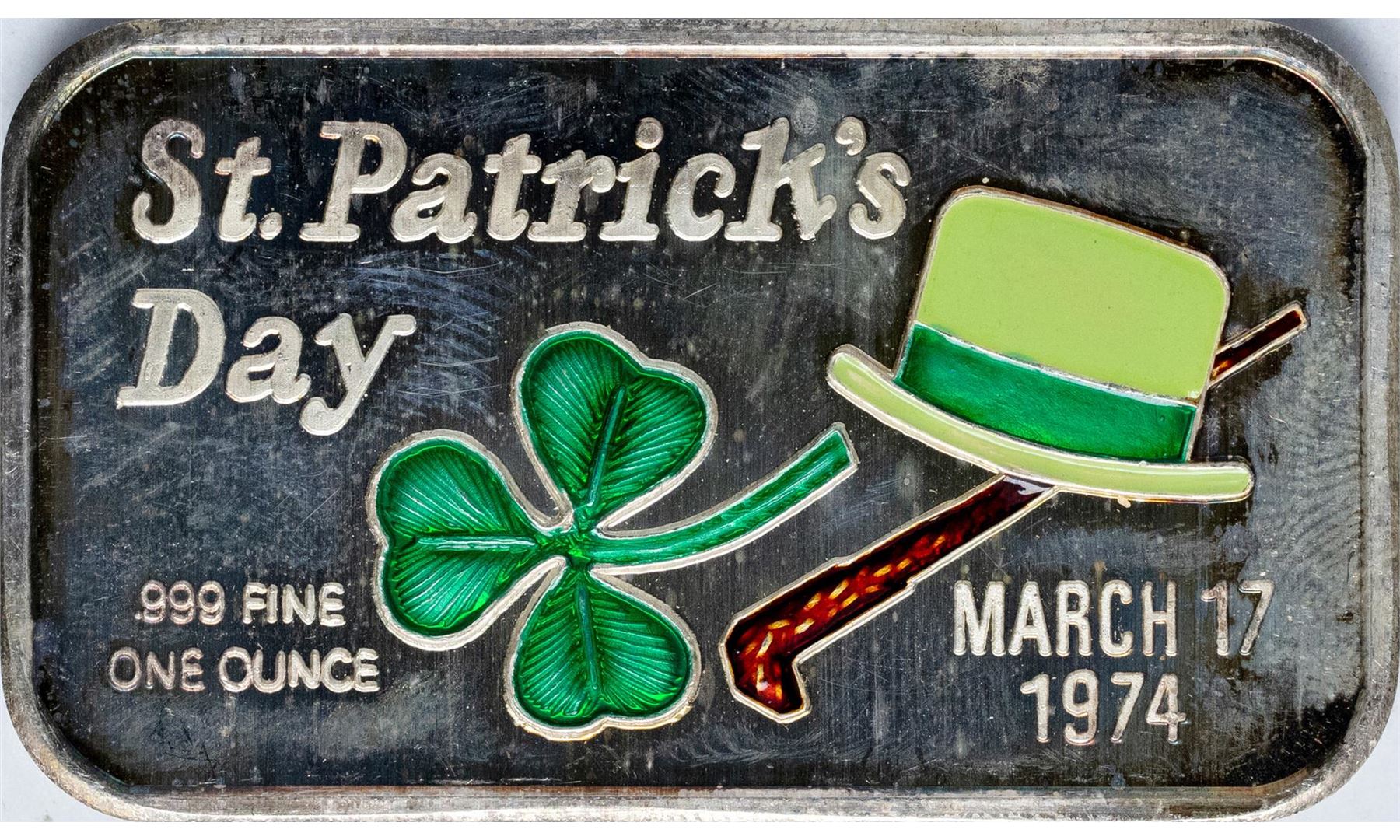 One March 17, 1974 St. Patrick's Day Enamel Silver Art Bar.