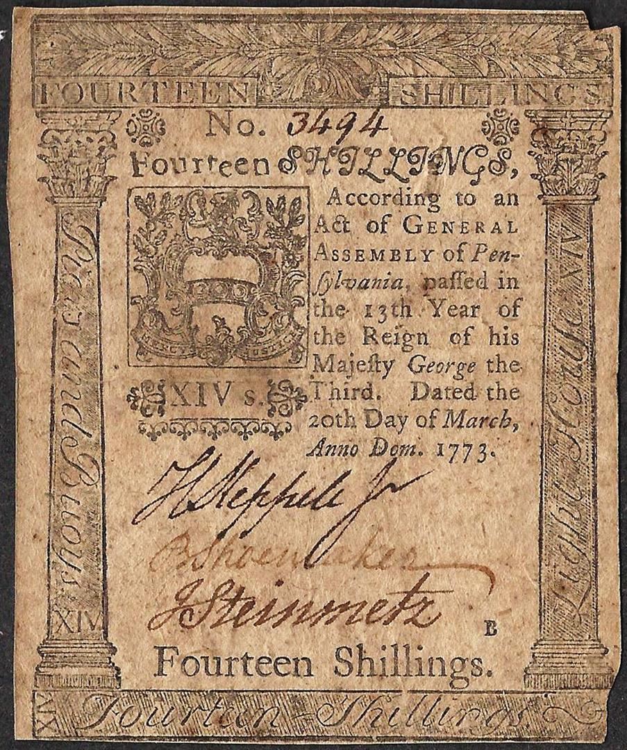 March 20, 1773 Pennsylvania Fourteen Shillings Colonial Currency Note