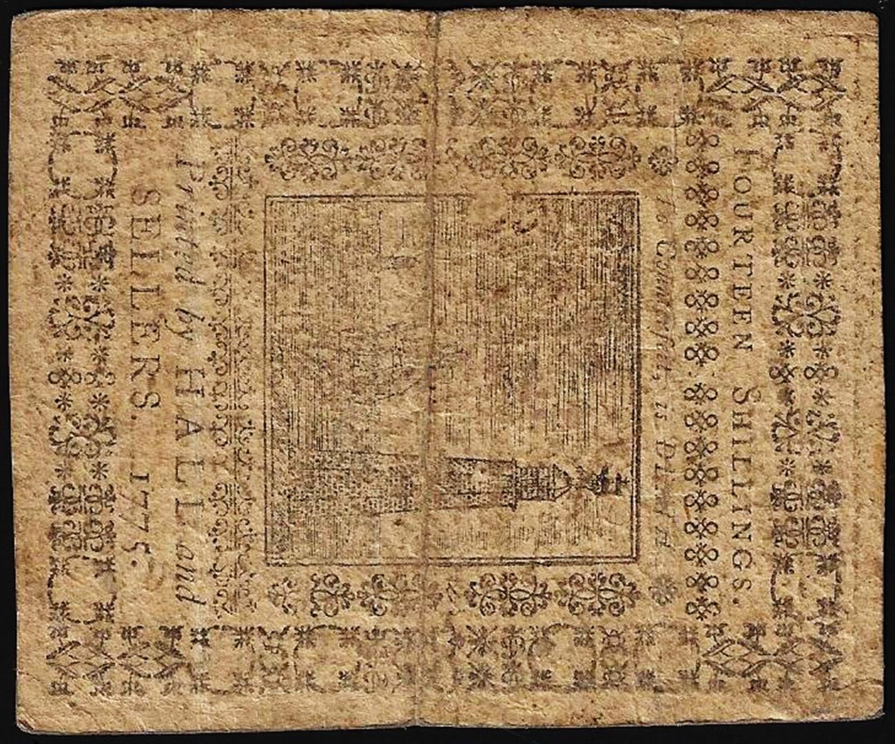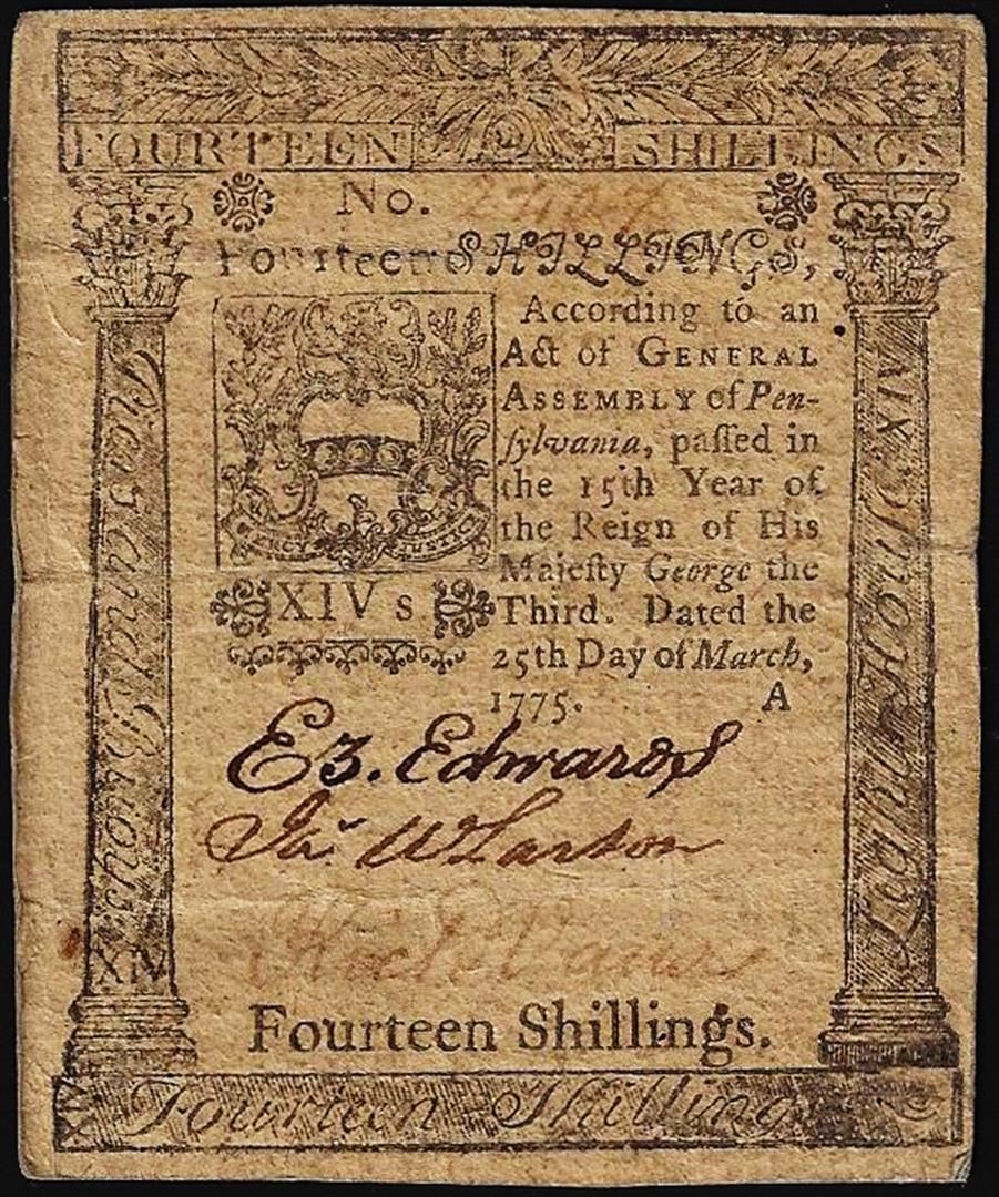 One March 25, 1775 Pennsylvania Fourteen Shillings Colonial Currency Note.