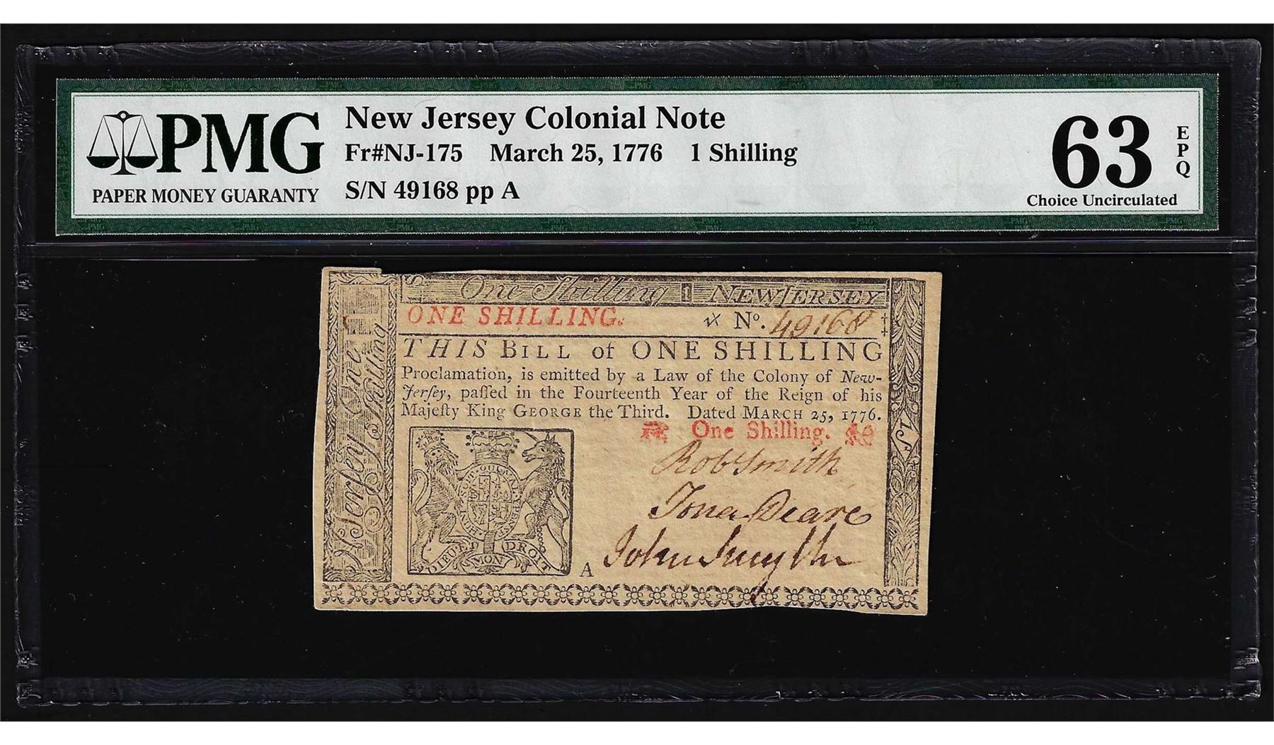 March 25, 1776 New Jersey 1 Shillings Colonial Note PMG Choice Uncirculated 63EP